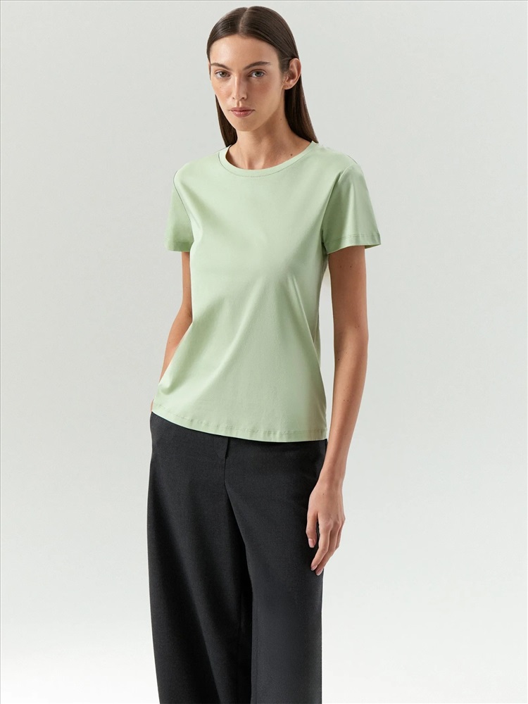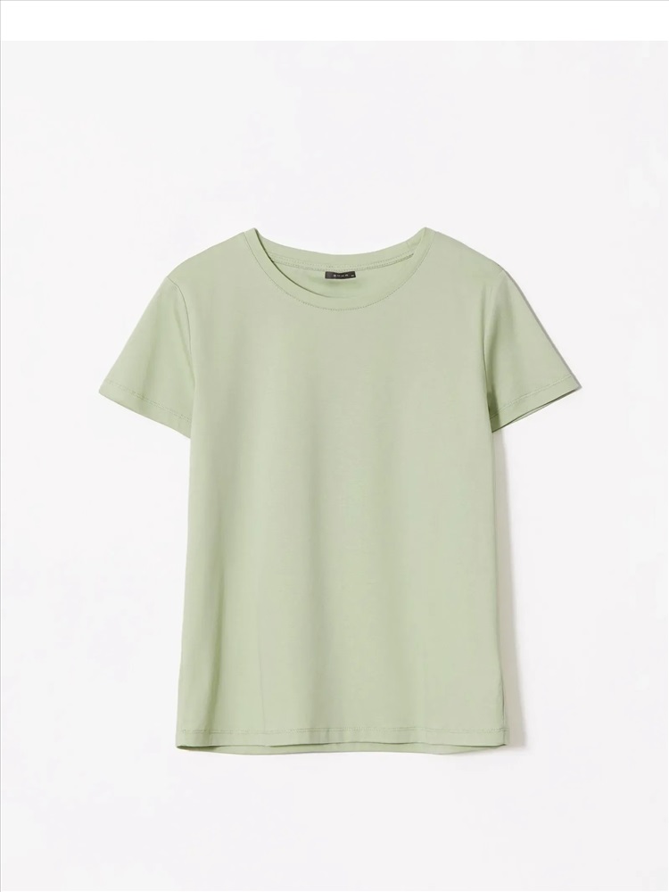 Базовая трикотажная футболка светло-зелёного оттенка. Модель прямого силуэта выполнена из плотного непросвечивающего хлопка. Универсальная длина позволяет носить изделие как навыпуск, так и в заправленном виде. Однотонная футболка будет незаменимой базовой вещью в любом гардеробе.