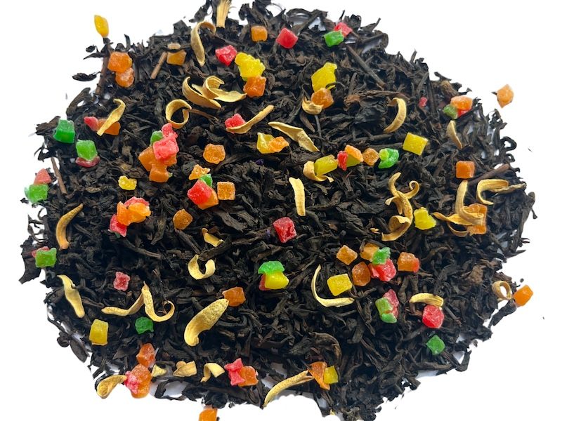 Купаж крупнолистового Шу Пуэра 5-летней выдержки из провинции Юньнань, кубиков папайи, ананаса и манго, цветов апельсинового дерева. С ароматом тропических фруктов.