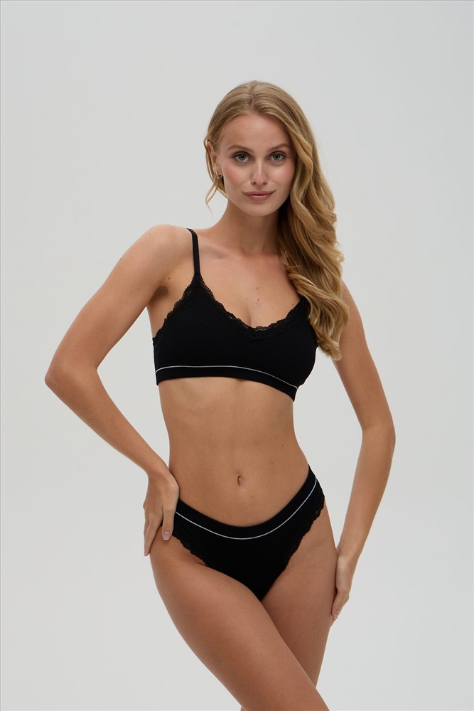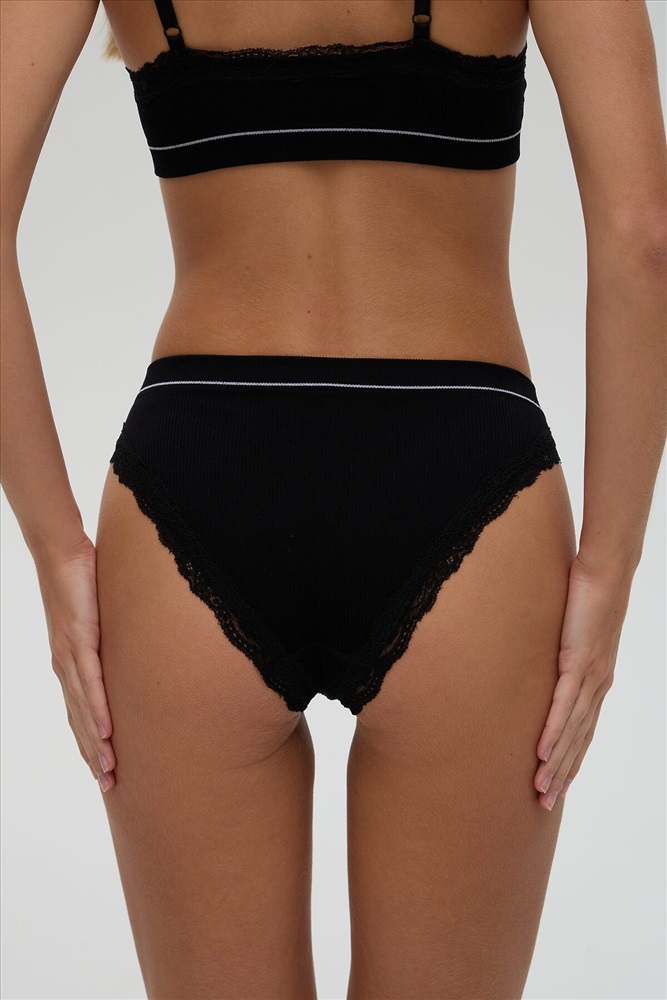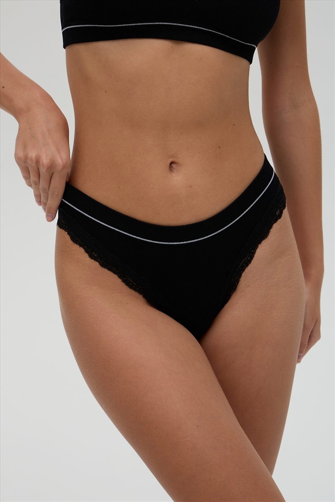 Трусики формы Brief со средней посадкой выполнены из нежного полотна в рубчик. Нежное кружево по срезу ножек и резинка, с вывязанной полоской контрастного цвета, по верхнему краю изделия украшают его.Ластовица из хлопка