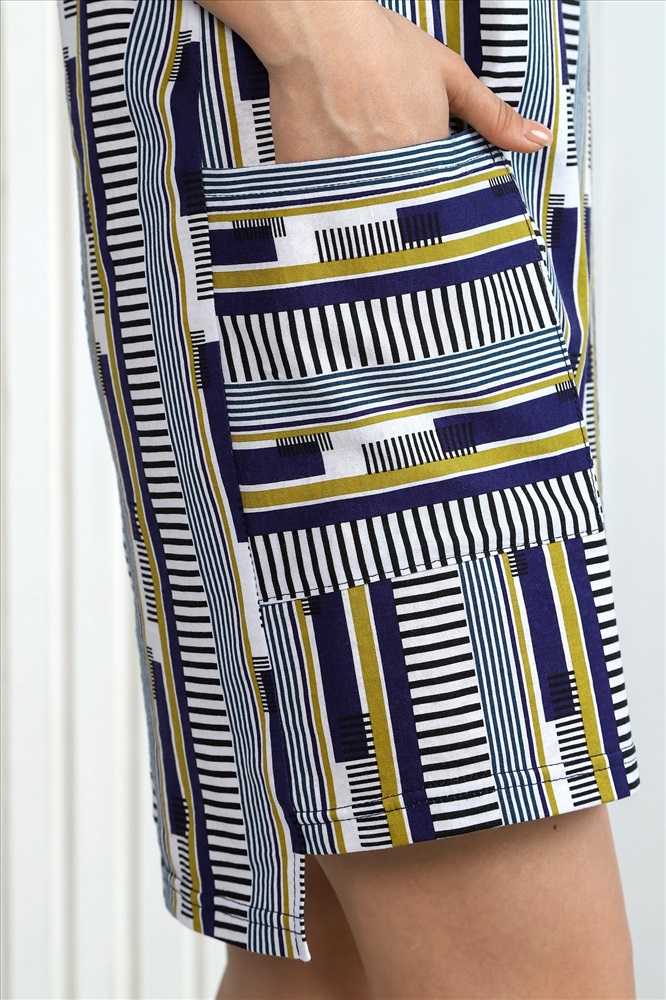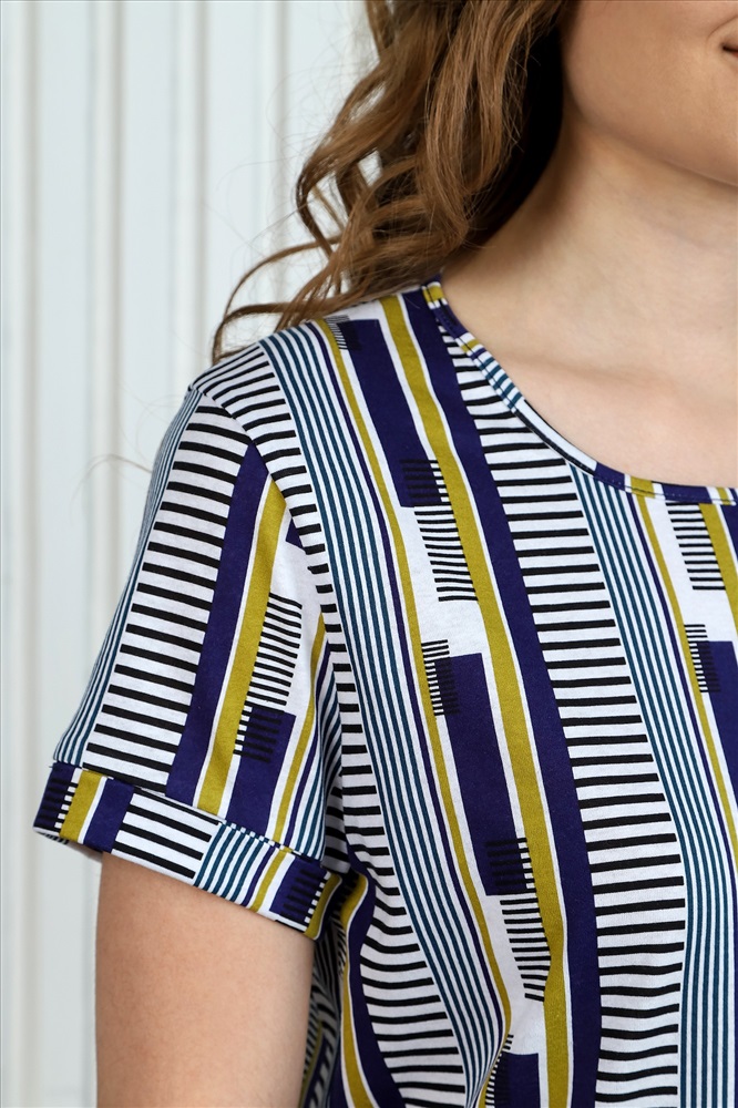 Туника молодежная из трикотажного полотна «кулирка» с набивным геометрическим рисунком, прямого силуэта, с короткими рукавами, окантованной горловиной овальной формы, накладным карманом на полочке справа. Рукава – с притачными манжетами- отворотами. Модным элементом является разность длин полочки и спинки.