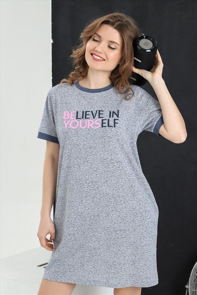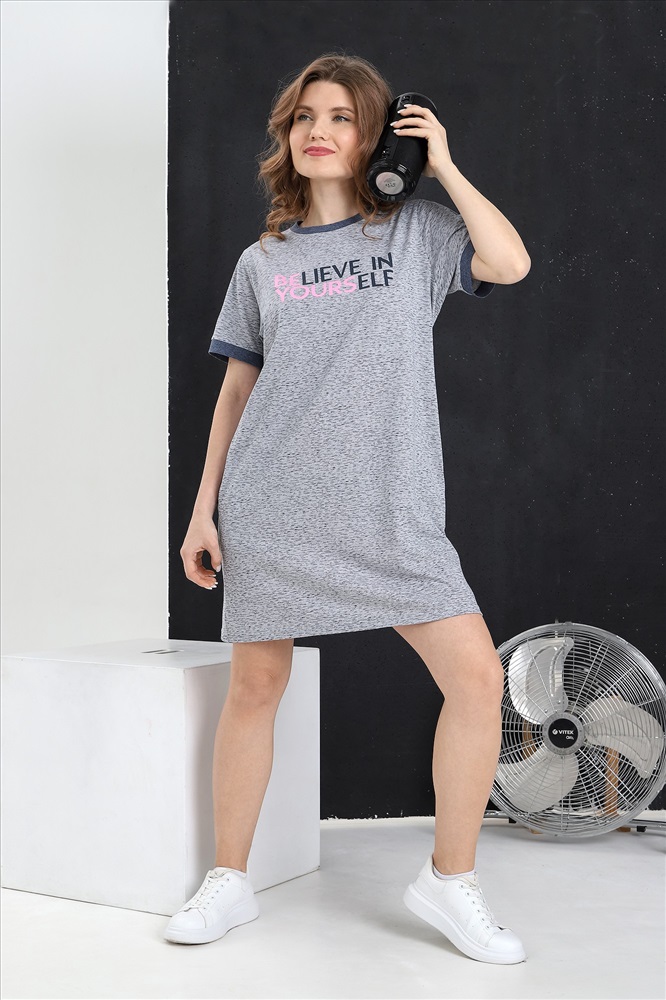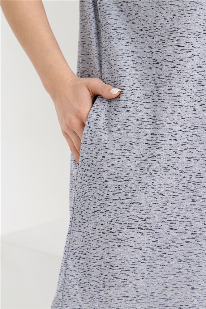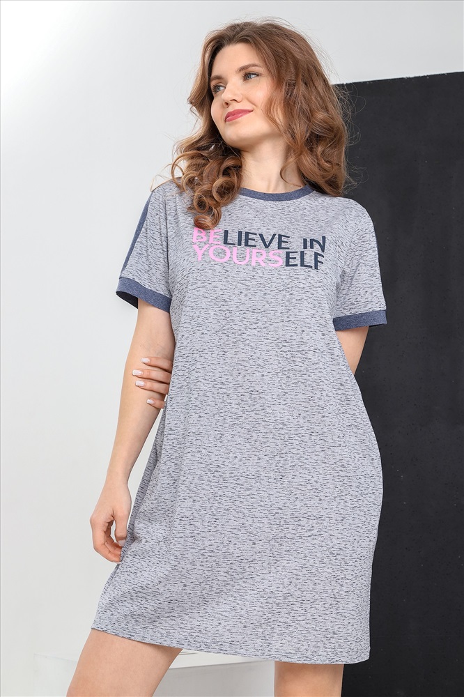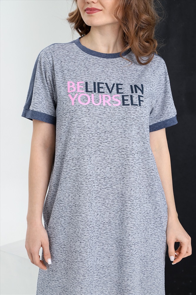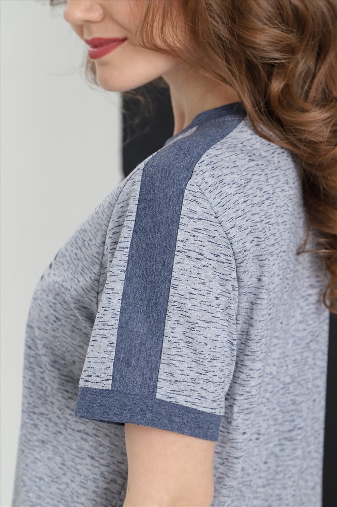 Туника молодежная из трикотажного меланжированого полотна «кулирка» в двух видах контрастных по цвету, прямого силуэта с короткими втачными рукавами и отделочной вставкой в области плечевых швов, принтом на полочке, выполненным в технике «шелкография». Горловина и рукава обработаны притачной планкой и манжетами контрастного цвета, в боковых швах карманы.