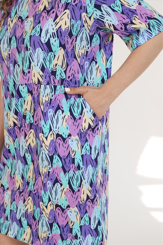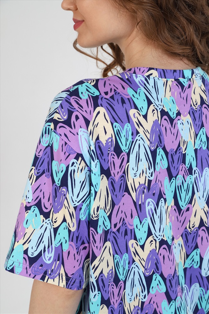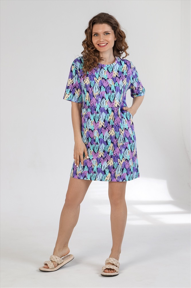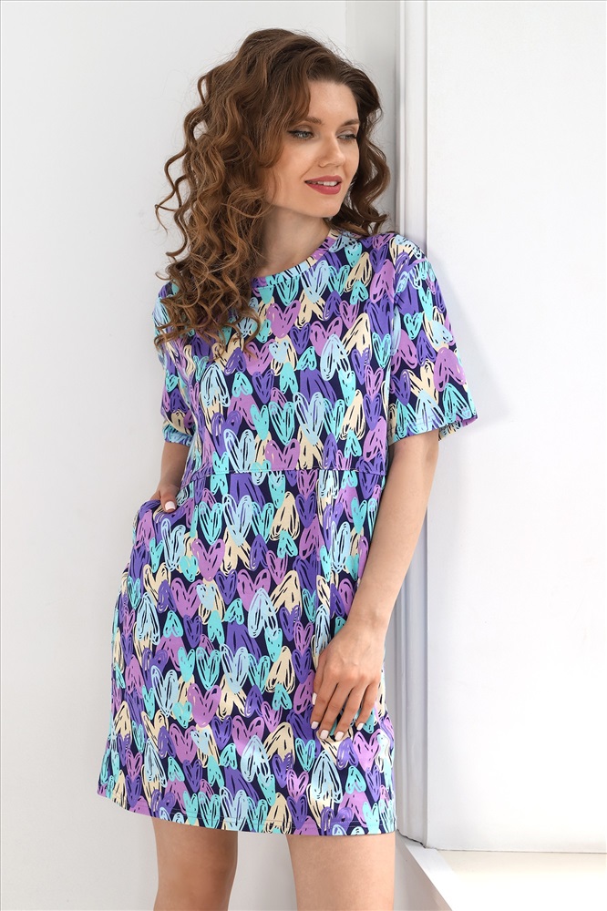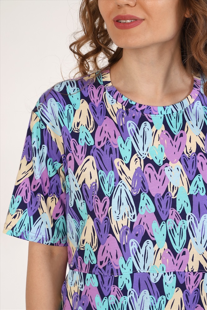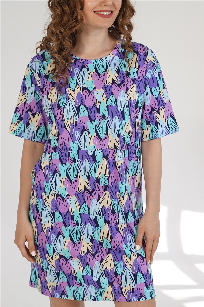 Туника молодежная из набивного трикотажного полотна «кулирка» свободного покроя, с короткими втачными рукавами, горловиной овальной формы обработанной притачной бейкой. Перед отрезной по линии талии, в нижней части располагаются карманы.