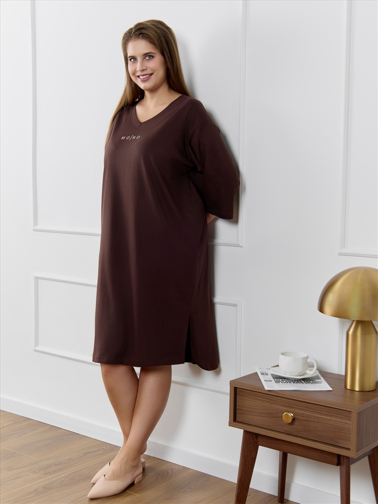 Туника женская из гладкокрашенного полотна «кулирка», свободного кроя, со спущенной линией плеча, втачными рукавами длиной до локтя, горловиной V-образной формы обработанной втачной планкой и принтом на полочке выполненным в технике «шелкографии». Модным элементом является разность длин фигурного низа изделия: низ полочки – прямой укороченный, низ спинки – удлиненный скруглённой формы.
