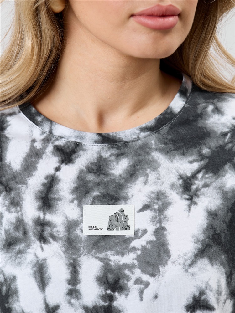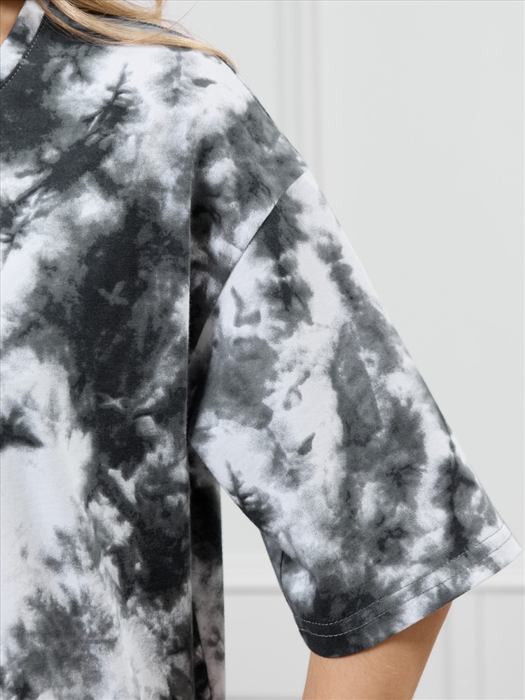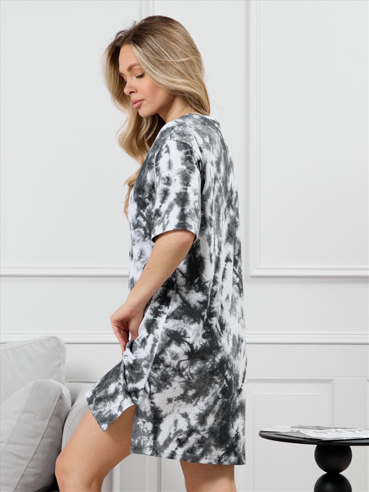 Ткань: Кулирка (пенье) Туника молодежная из трикотажного полотна «кулирка» с набивным рисунком, прямого силуэта, с короткими втачными рукавами, горловиной овальной формы, обработанной притачной бейкой из основного материала, с разрезами в боковых швах. По центру полочки рядом с горловиной настрочен декоративный элемент-нашивка.
