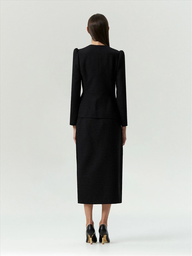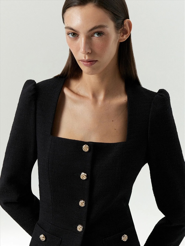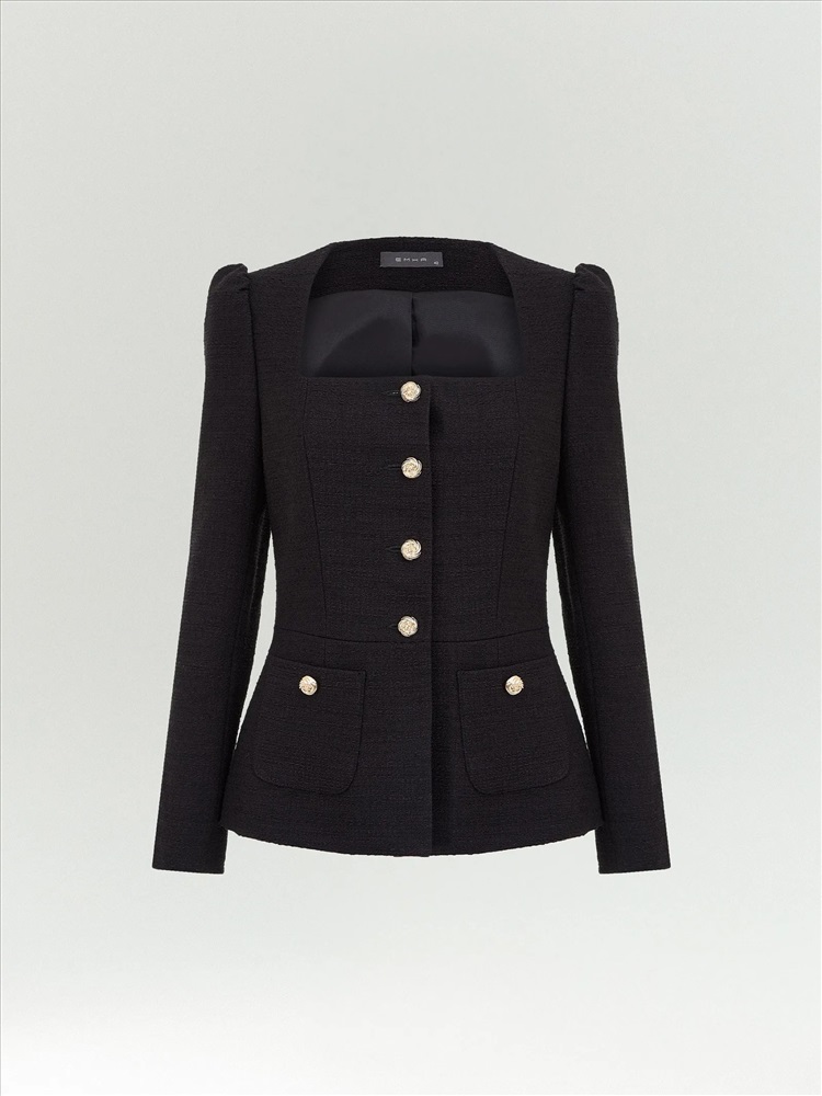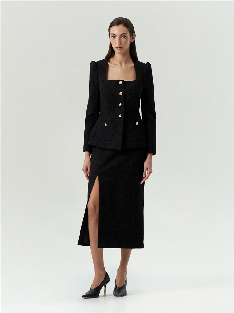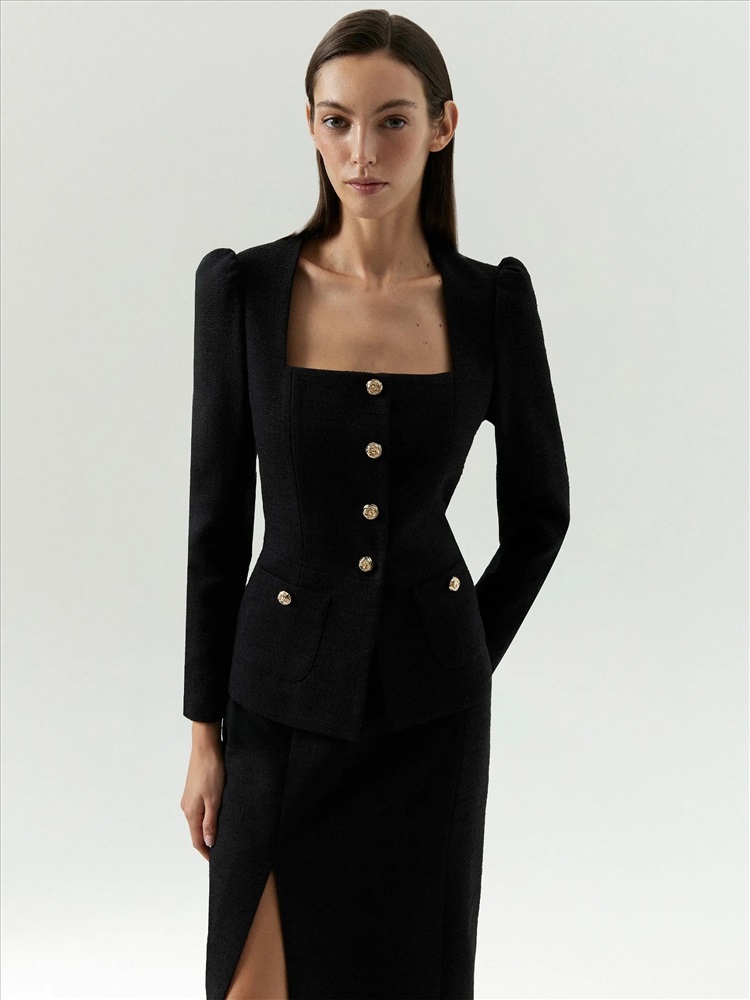 Элегантный жакет в стиле femme fatale из чёрного твида подойдёт не только на выход, но и на каждый день. Модель отличает очень женственное сочетание рукава-фонарика без излишней пышности и аристократичного выреза-каре. Лёгкая нотка стиля принцессы в зрелом и статусном образе, который смотрится респектабельно. Ещё одна изюминка жакета — изысканная фунитура в виде изящных завитков золотистого цвета. Жакет можно завершить элегантной юбкой из комплекта или другим вариантом низа.