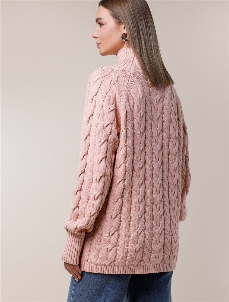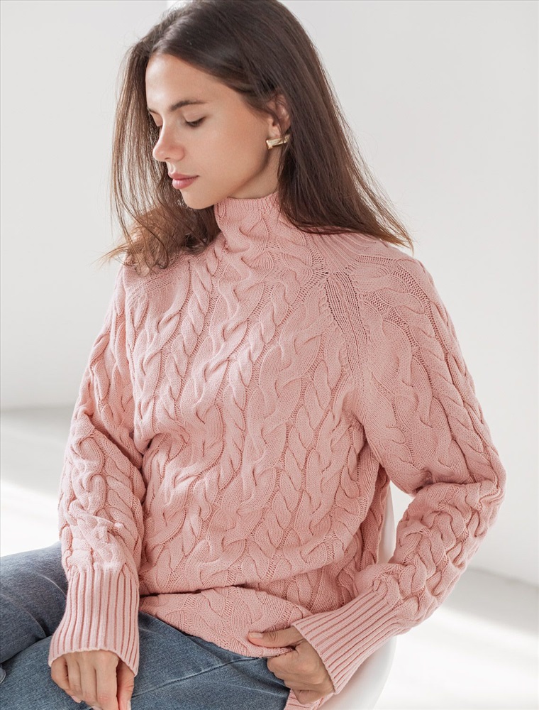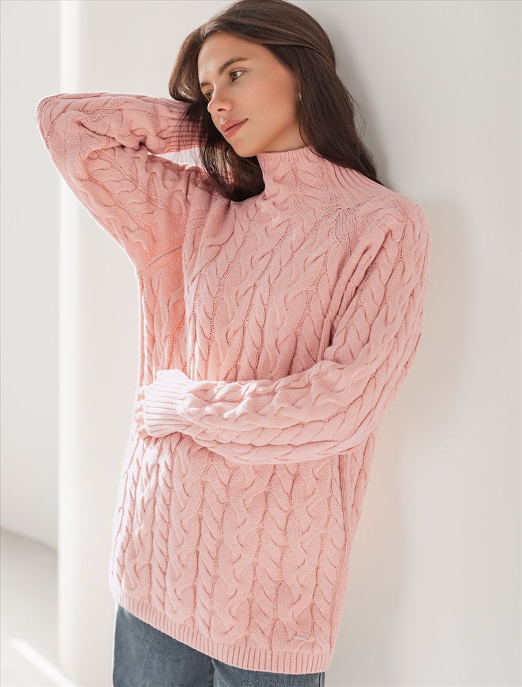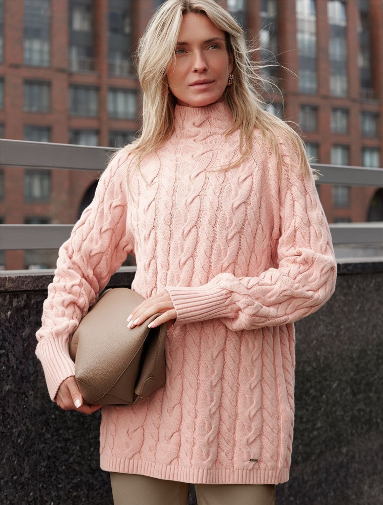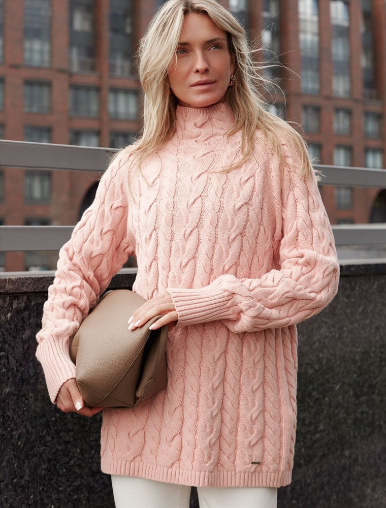 Параметры модели на первом фото: Рост 170, бюст 83, талия 64, бедра 88 Свитер выполнен из мягкой хлопковой пряжи фактурной вязки с добавлением акрила. Удлиненная модель силуэта over-size с воротом-стойка и узором косы во всю длину. Хорошо поддерживает тепло, при этом не перегревая тело. Сохраняет первоначальный внешний вид даже после множества стирок. Свободный силуэт позволяет носить изделие на футболку или рубашку с любым низом. Из украшений металлический логотип бренда.