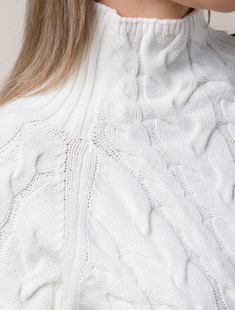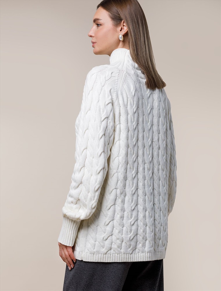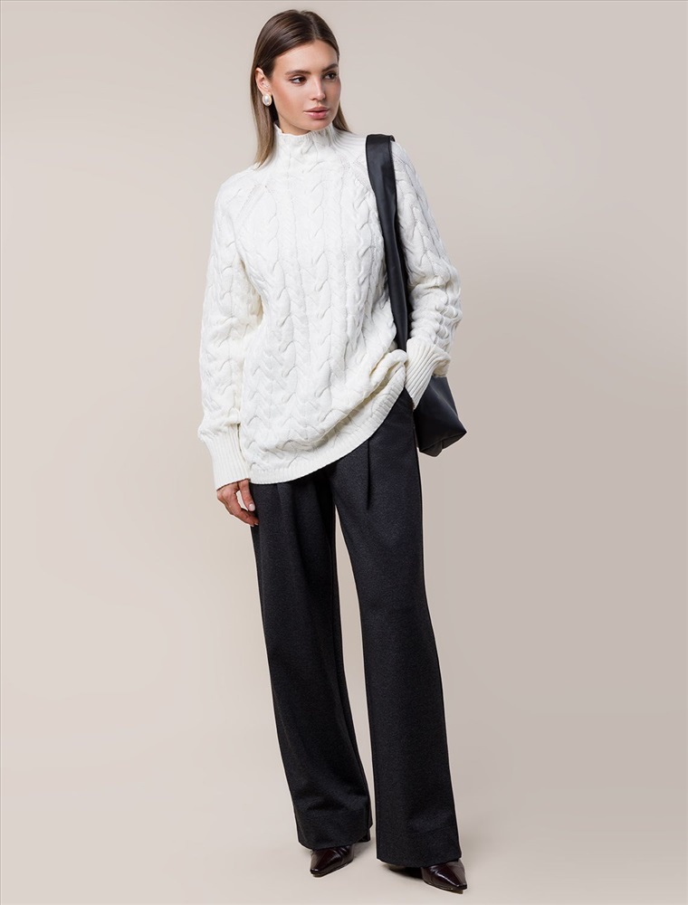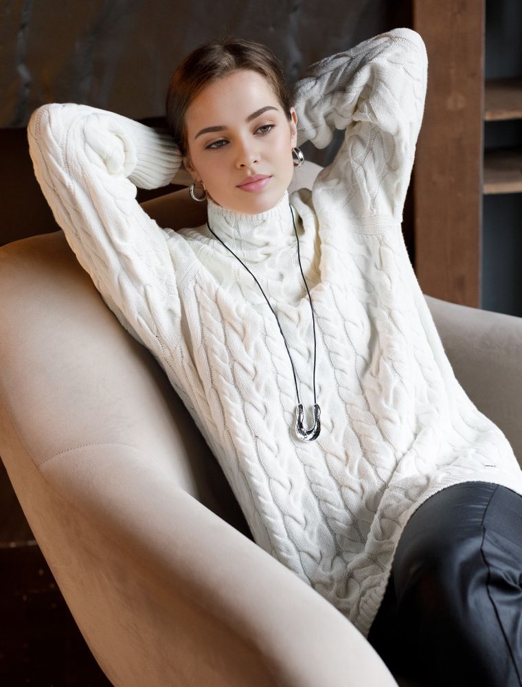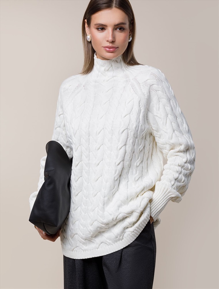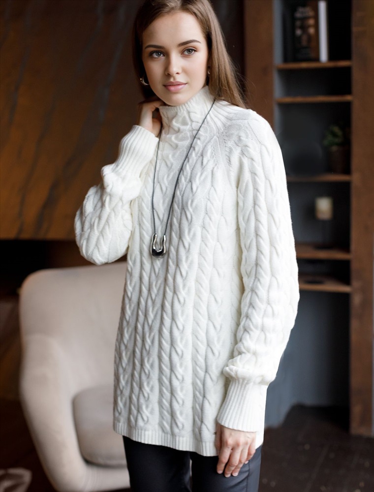 Параметры модели на первом фото: Рост 172, бюст 88, талия 64, бедра 88 Свитер выполнен из мягкой хлопковой пряжи фактурной вязки с добавлением акрила. Удлиненная модель силуэта over-size с воротом-стойка и узором косы во всю длину. Хорошо поддерживает тепло, при этом не перегревая тело. Сохраняет первоначальный внешний вид даже после множества стирок. Свободный силуэт позволяет носить изделие на футболку или рубашку с любым низом. Из украшений металлический логотип бренда.