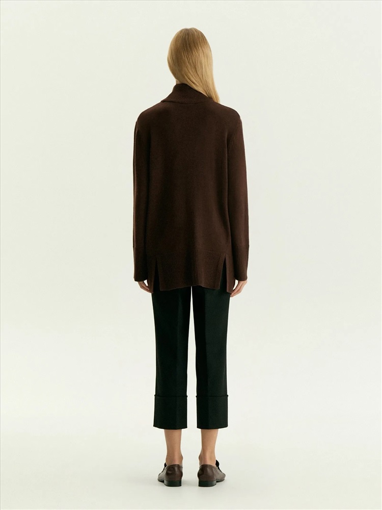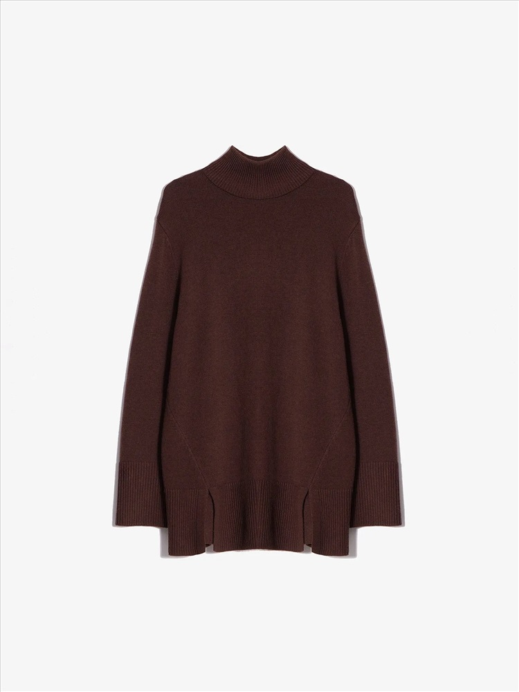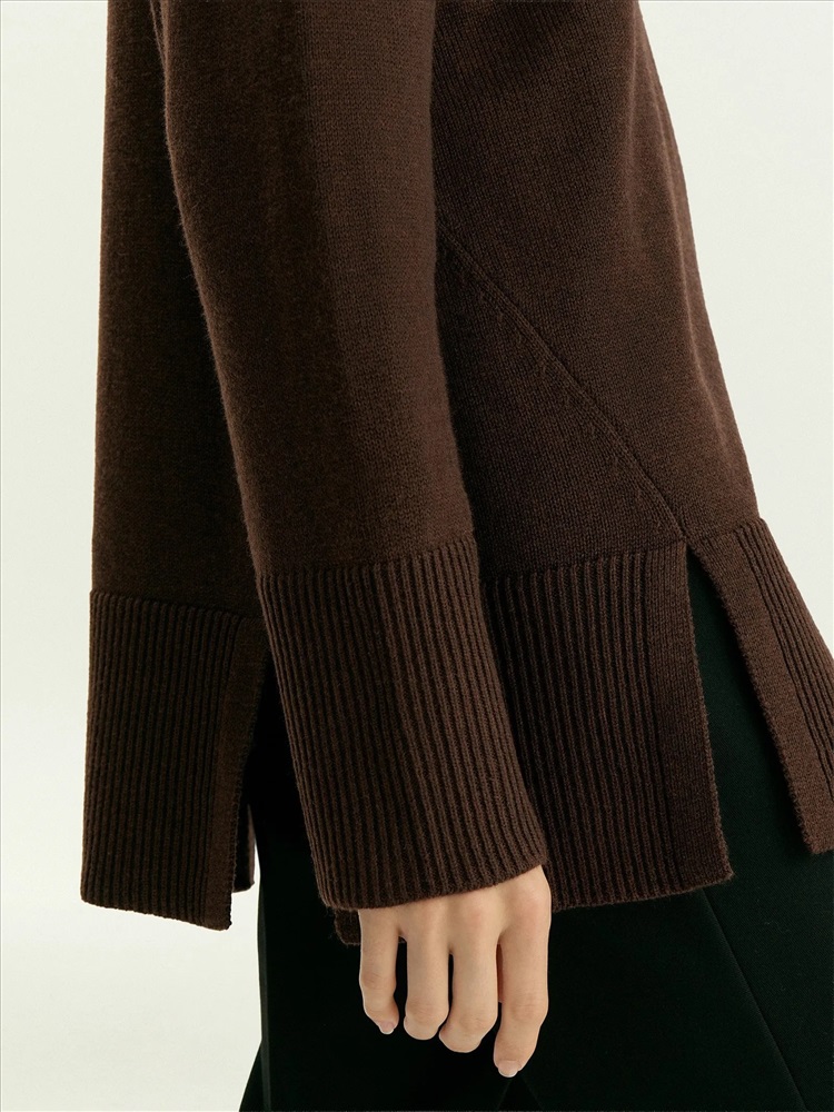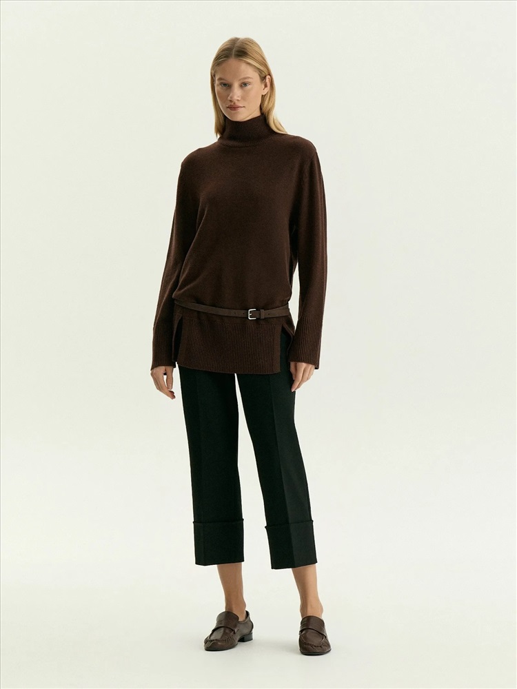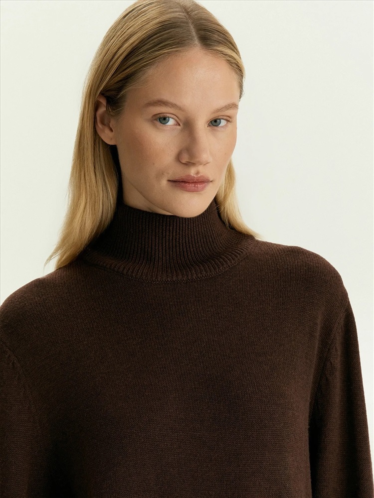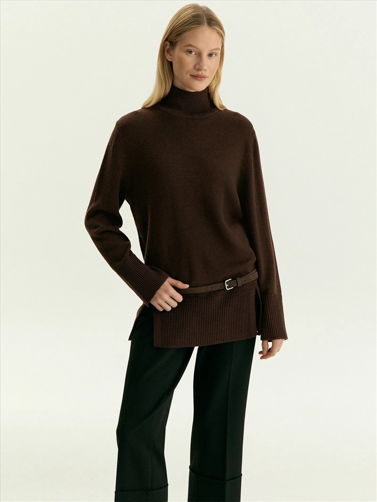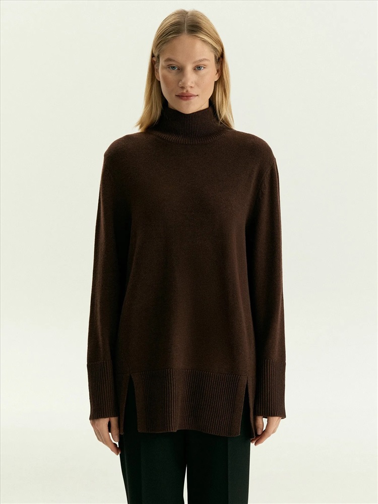 Удлинённый джемпер в коричневом цвете с натуральной шерстью — незаменимая вещь в базовом гардеробе. Уютный вариант для тех, кто любит свободную посадку, высокий ворот и удлинённые рукава. Сбоку модель украшает небольшой разрез, что соответствует трендам сезона. Джемпер отлично сочетается с денимом, как классическим, так и гранжевым.