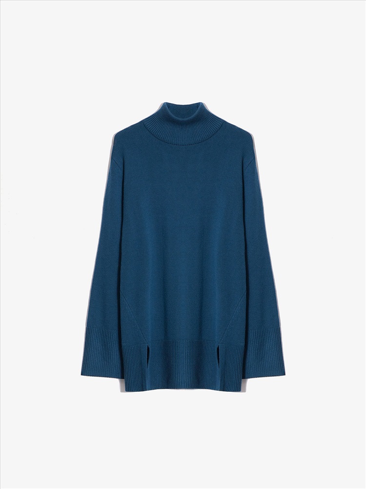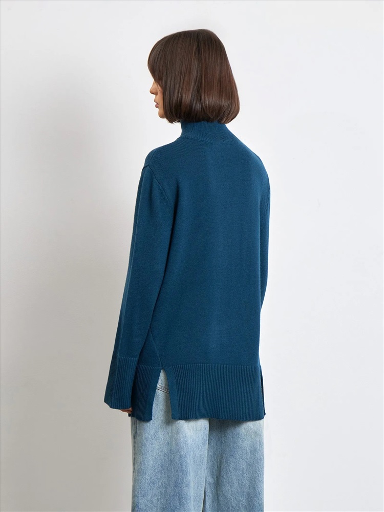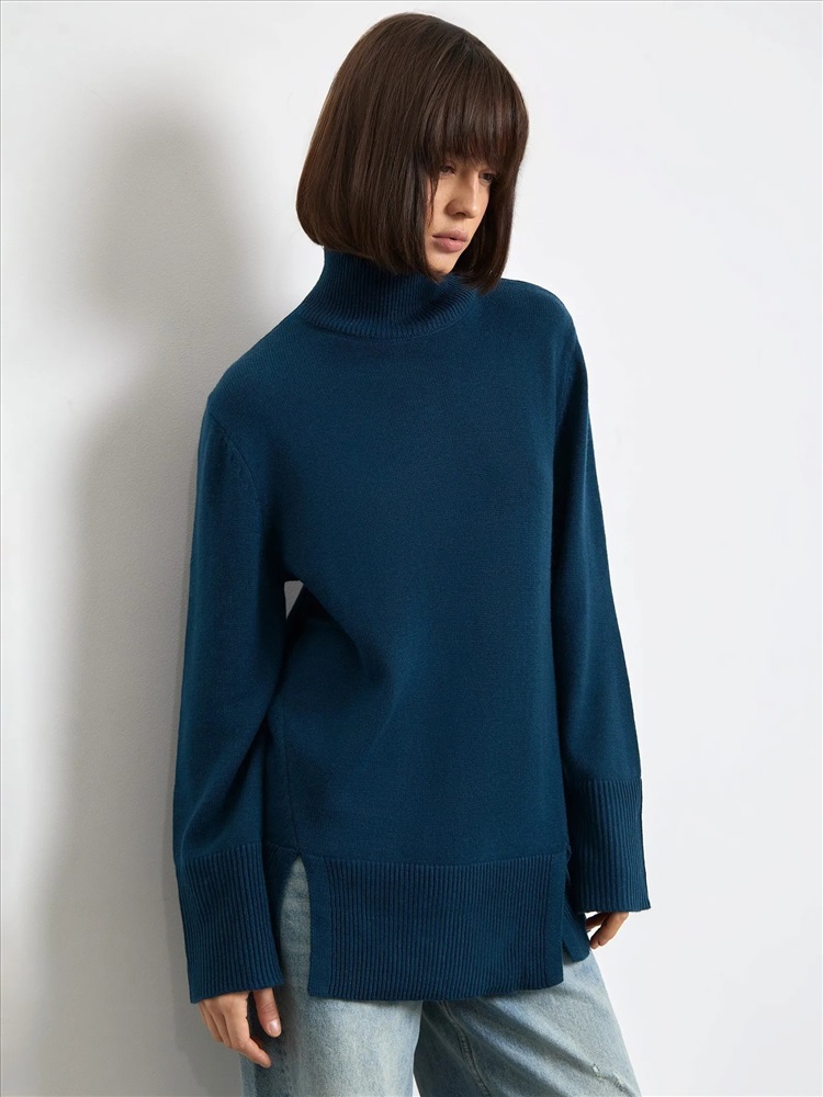 Удлинённый джемпер в тёмно-зелёном цвете с натуральной шерстью — универсальная вещь в гардеробе. Уютный вариант для тех, кто любит свободную посадку, высокий ворот и удлинённые рукава. Сбоку модель украшает небольшой разрез, что соответствует трендам сезона. Джемпер отлично сочетается с денимом, как классическим, так и гранжевым.