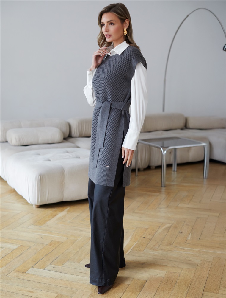 Размер товара на первом фото: 42 Удлиненный жилет выполнен из мягкой пряжи с кашемиром. Модель фактурной вязки дополнена высокими боковыми разрезами и поясом в тон изделия. Хорошо сочетается водолазками, лонгсливами и блузками. Мягкая пряжа очень приятная к телу, поддержит комфорт на протяжении всего дня, при этом не перегревая. Сочетается в костюме с брюками D38.013, D38.012 и юбкой D36.016