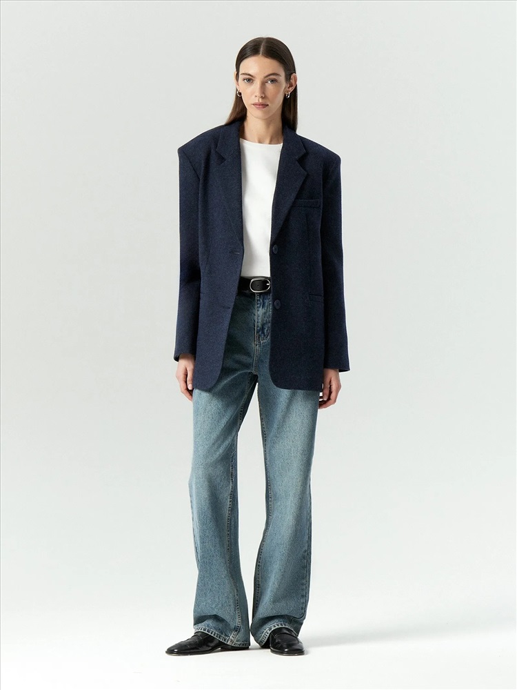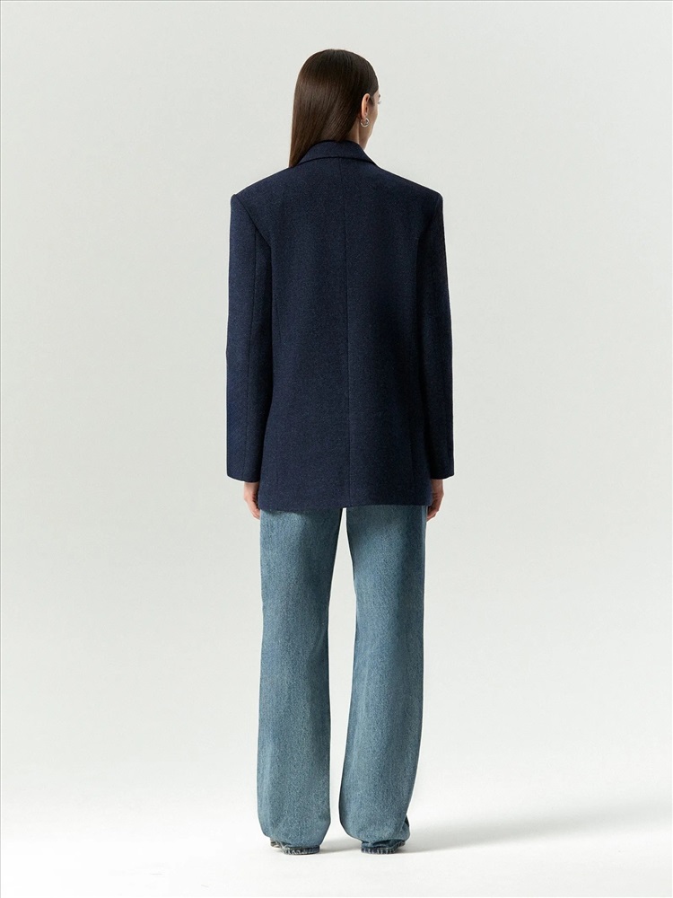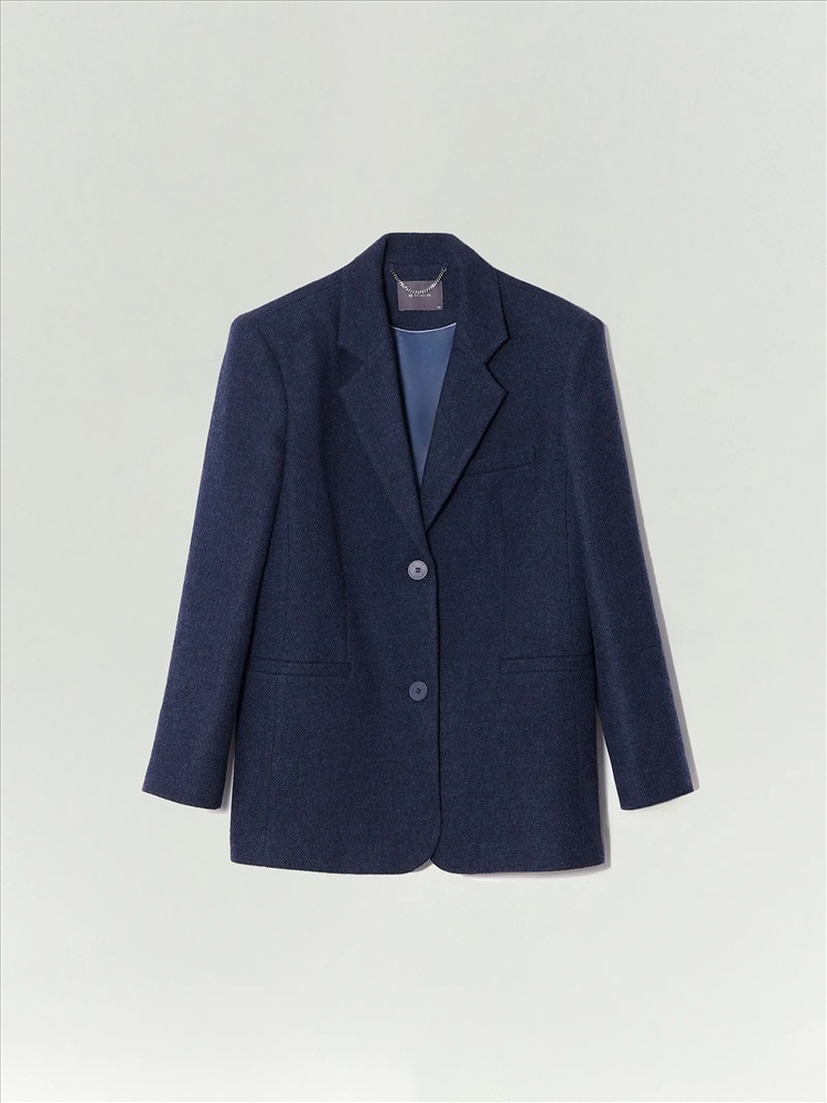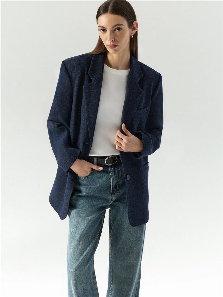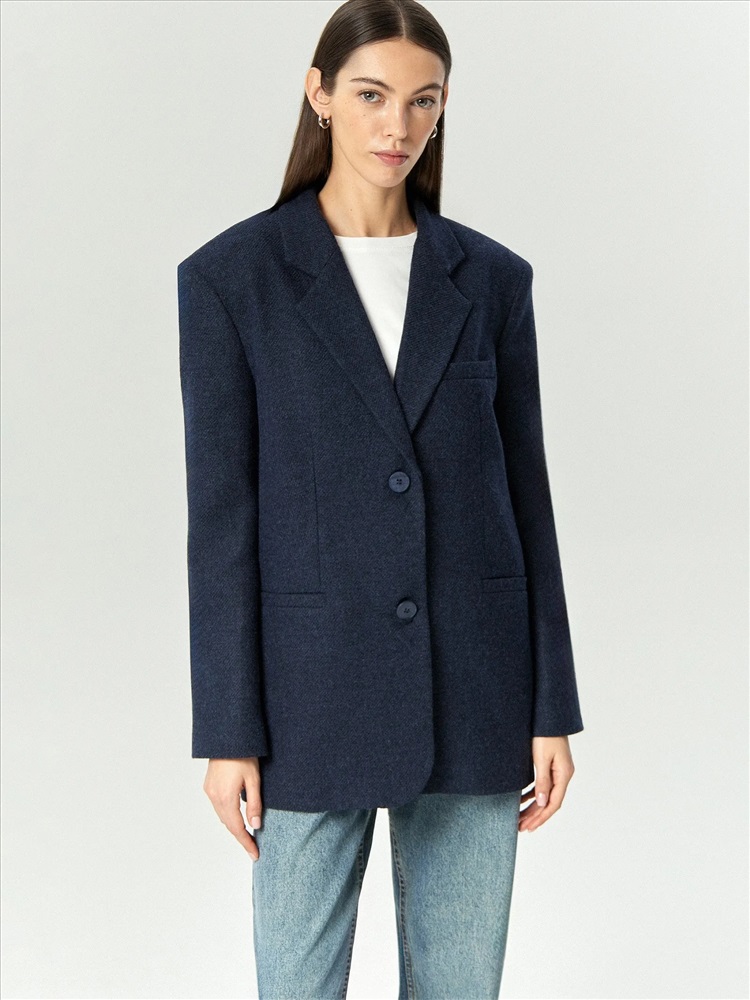 Пальто-жакет в тёмно-синем цвете станет базой демисезонных образов. Подойдёт в качестве верхнего слоя на начало осени или середину весны. Плотный материал более чем на 2/3 состоит из натуральной шерсти. Изделие выполнено на подкладке с высоким содержанием дышащей вискозы. Однобортная модель с английским воротником выражает тренд на сочетание фасонов классических офисных костюмов и пальтовых тканей.