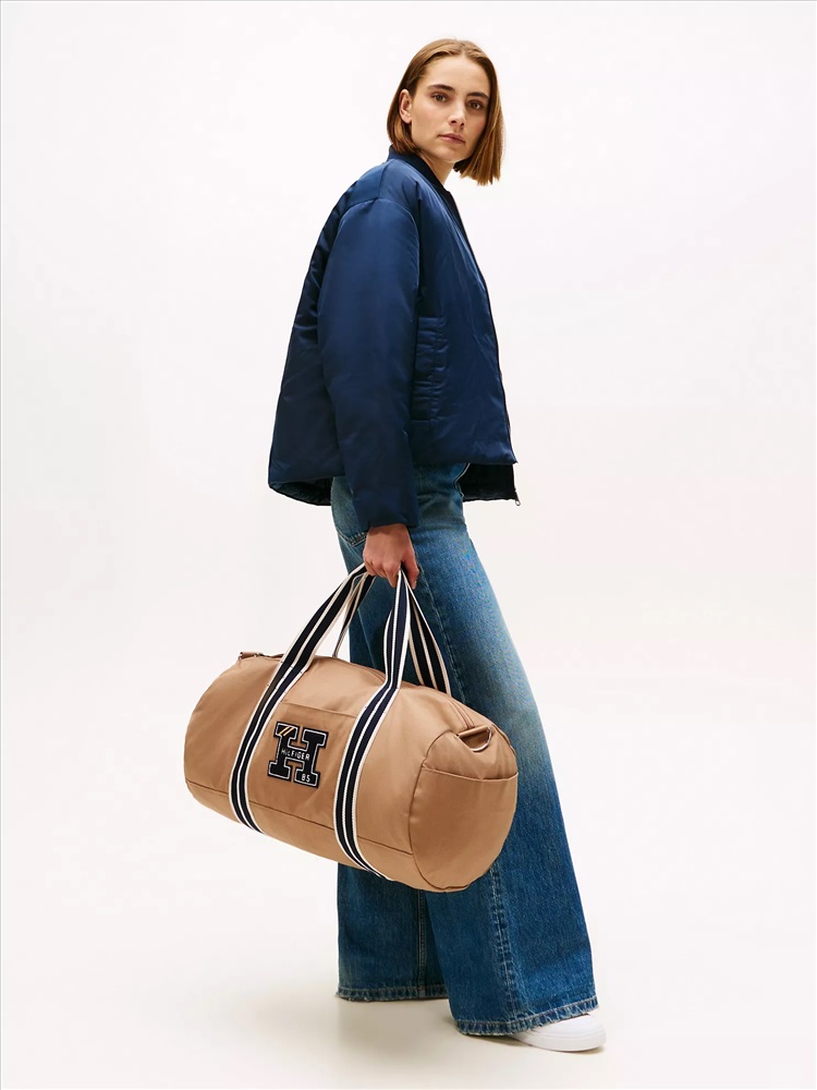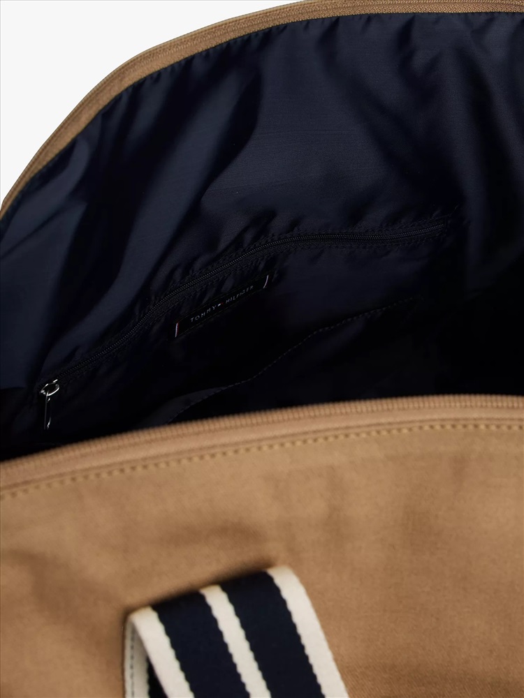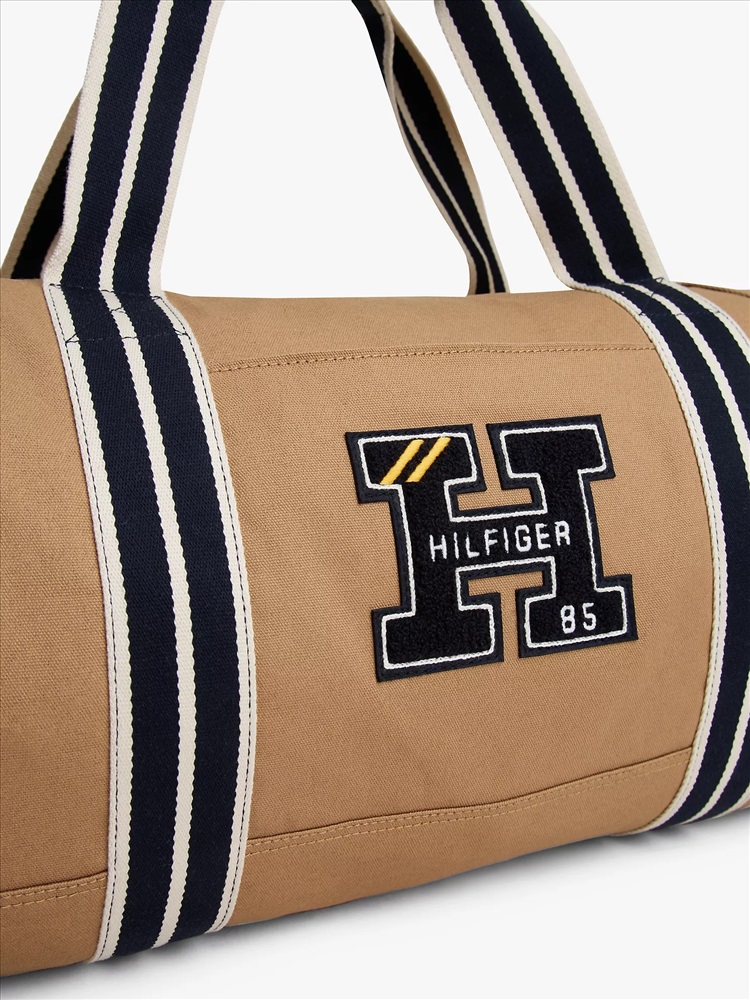 Tommy Hilfiger men's bag. Our sturdy varsity duffle features a no-fuss open interior to tote your essentials to the gym, on a weekend jaunt, or wherever the day may take you. Made from cotton canvas, it's built to take anything you can throw at it (or in it).