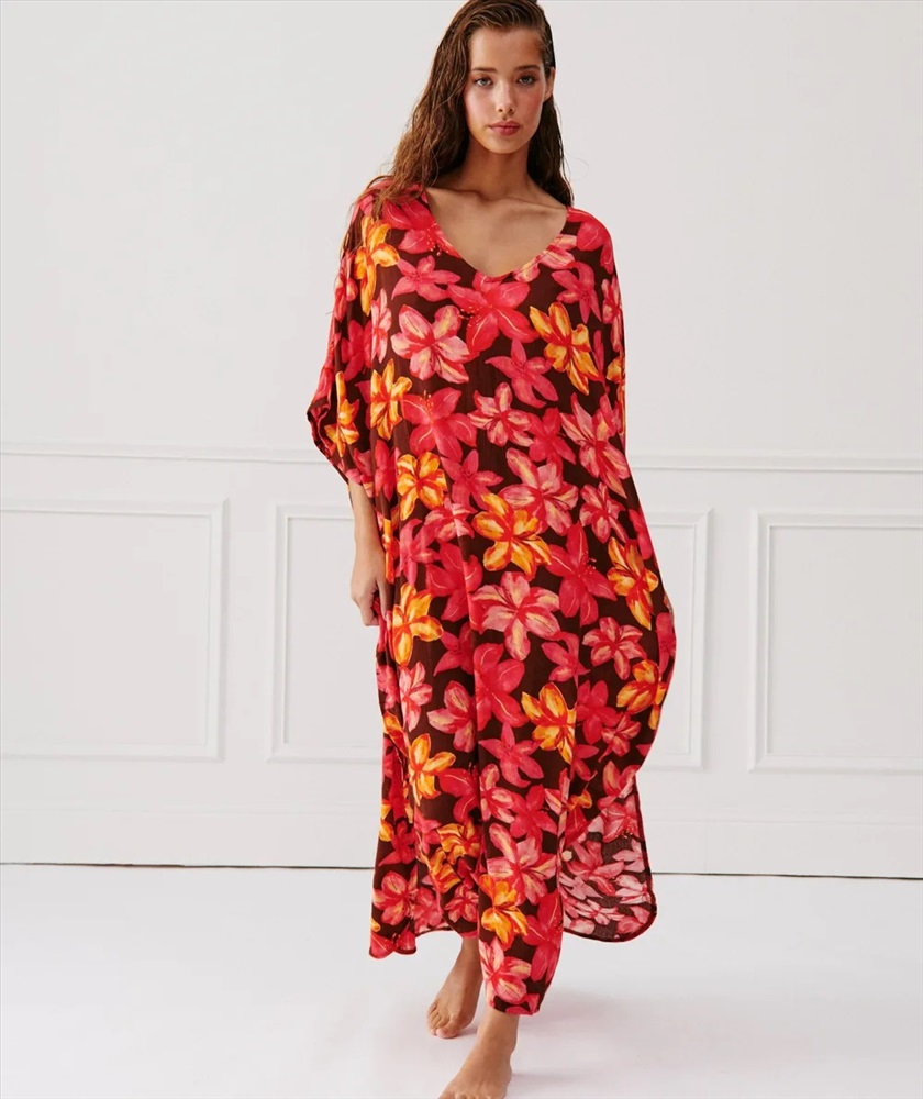 TROPIZ DRESS es una túnica ancha estilo caftán con un estampado floral de gran tamaño en tonos rojos y marrones. Ideal para llevar después de la playa o simplemente para relajarse. Confeccionada en viscosa ligera y fluida, TROPIZ es perfecta para los días calurosos. ? Комментарии к товару