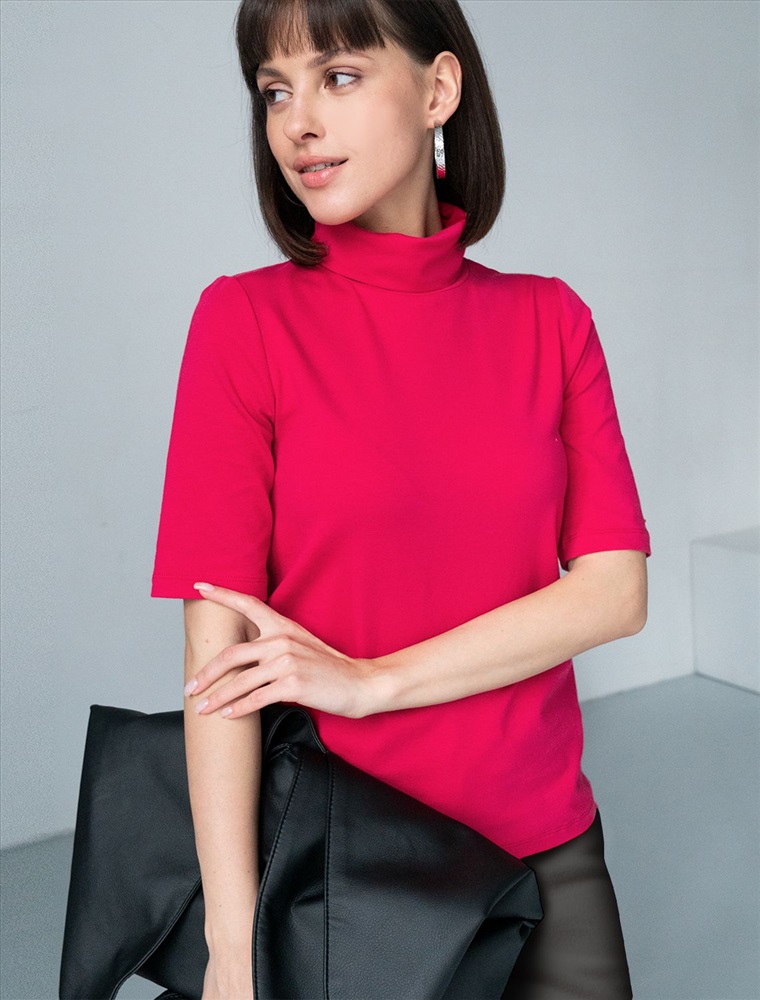 Базовая водолазка цвета этого года viva magenta с коротким рукавом выполнена из премиального хлопка с добавлением эластичных волокон. Гладкий трикотаж обеспечит гарантированный комфорт и удобство в использовании. На рукаве изделия металлическая нашивка с логотипом бренда. Совет стилиста: водолазку с коротким удобно сочетать с жакетом или блузкой. Также как самостоятельный верх к широким брюкам.
