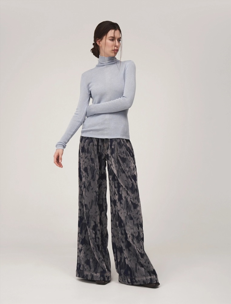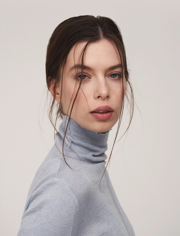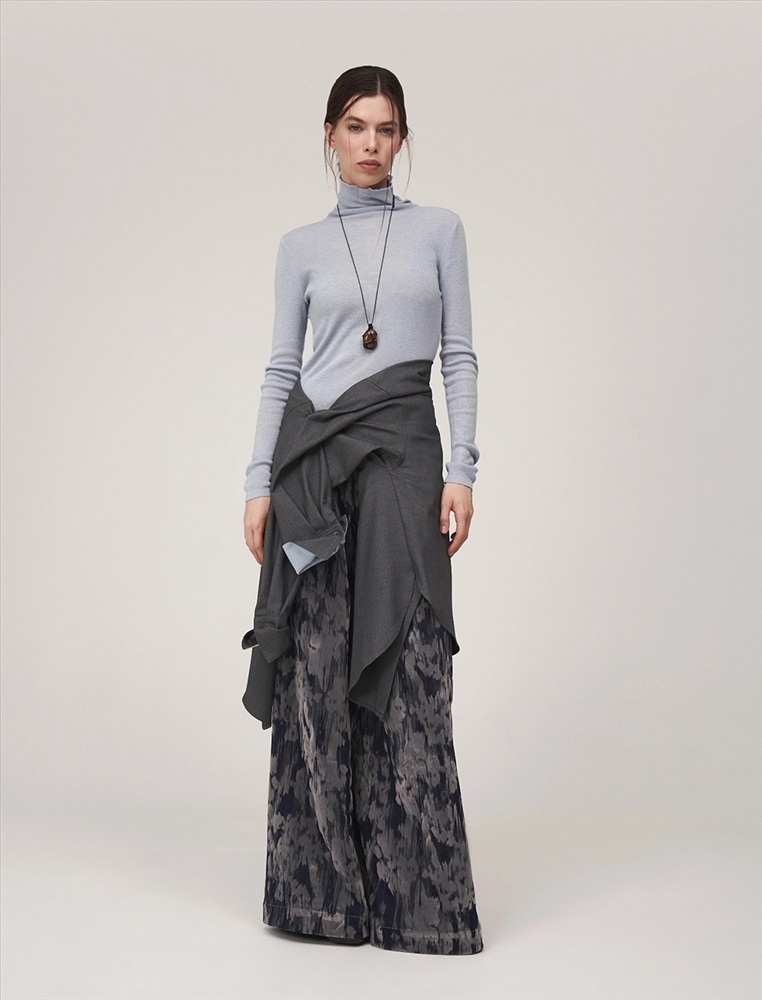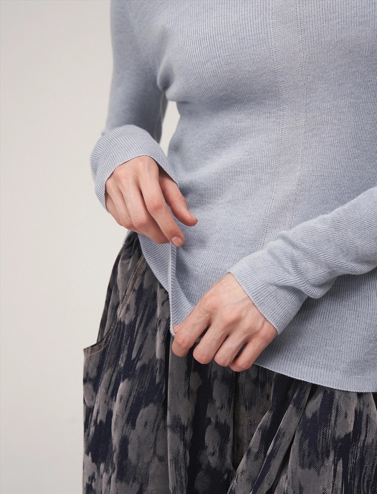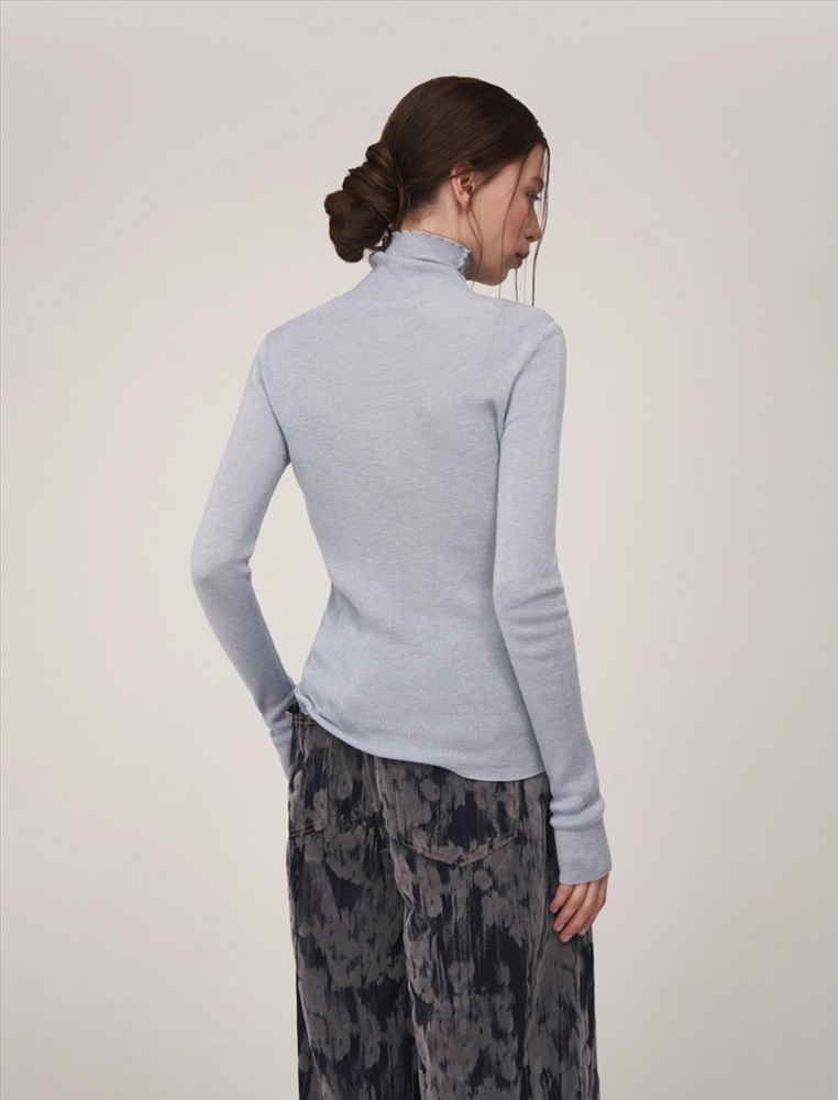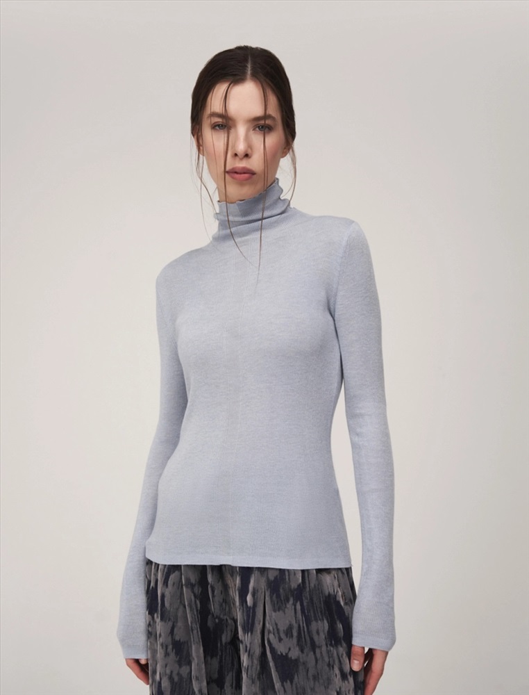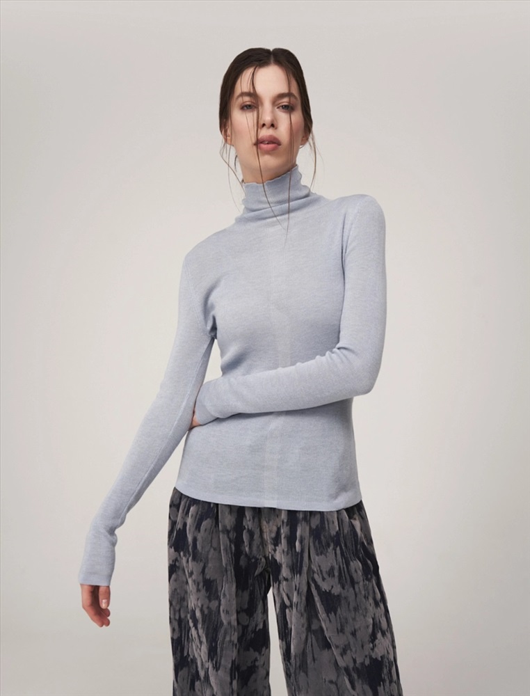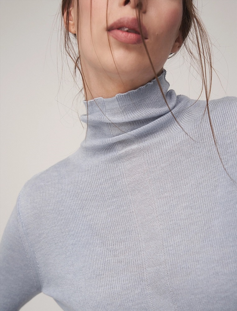 Вязаная водолазка прилегающего силуэта, с длинными рукавами и высоким воротником. По передней части изделия, по центру, проходит вертикальная полоса другого типа вязки. Выполнена из хлопка и акрила с добавлением кашемира и шелка, обеспечивающих мягкость, тепло и долговечность