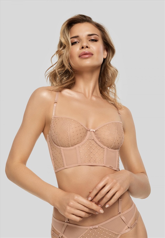 Полукорсет с мягкой чашкой на каркасной поддержке. Чашка выполнена из сетки с вышивкой. Внутри чашки боковой подкрой из сетки. Боковые поддерживающие косточки.
