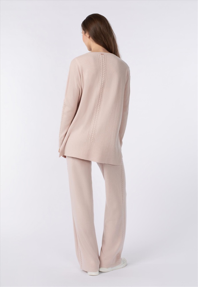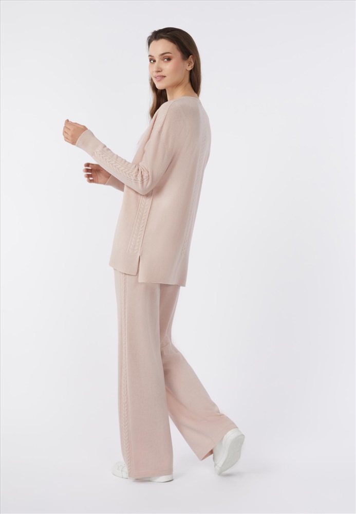 50% кашемир, 50% шерсть мериноса Брюки свободного кроя. Легкий клеш. Эластичный пояс со шнуром. Боковые карманы. Отделка косами по линии бока. Стрелки на передних деталях отстрочены – это удлиняет силуэт и делает его стройнее.