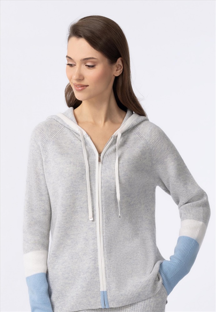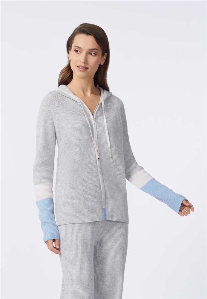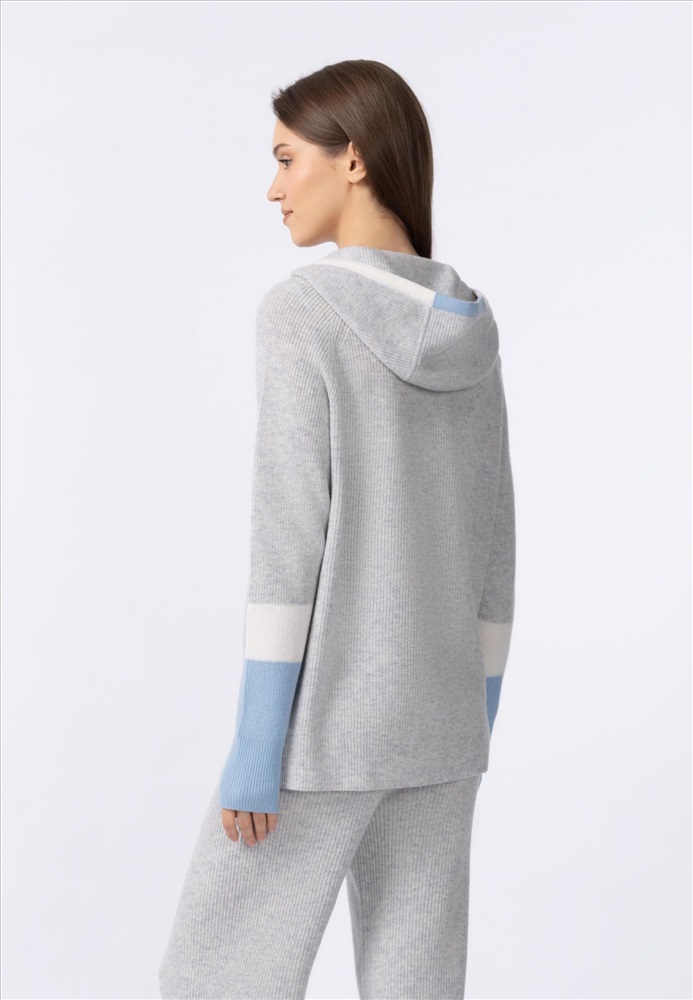 50% кашемир, 50% шерсть мериноса Джемпер с капюшоном на молнии из трикотажа в рубчик. Свободный крой, длина до середины бедра. По линии притачивания молнии и краю капюшона отделка узкими контрастными полосами. Манжеты и низ оформлены вязаной резинкой. Широкие двуцветные полосы в нижней части рукавов.