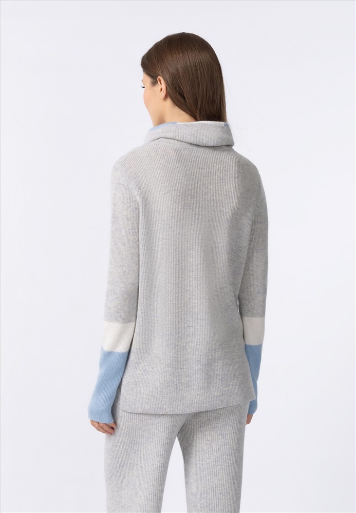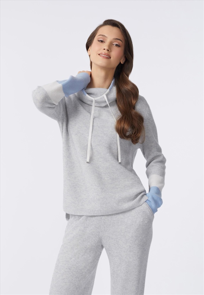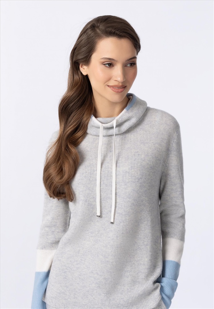 50% кашемир, 50% шерсть мериноса Свитер-худи свободного кроя из трикотажа в рубчик. Длина до линии бедер. Воротник-хомут со шнуром по отлетному краю. Манжеты и низ оформлены вязаной резинкой. Широкие двуцветные полосы в нижней части рукавов.