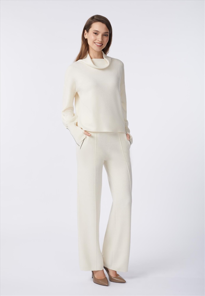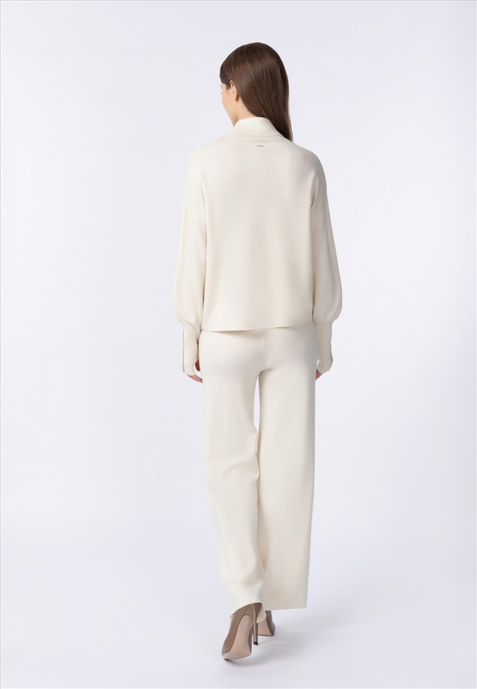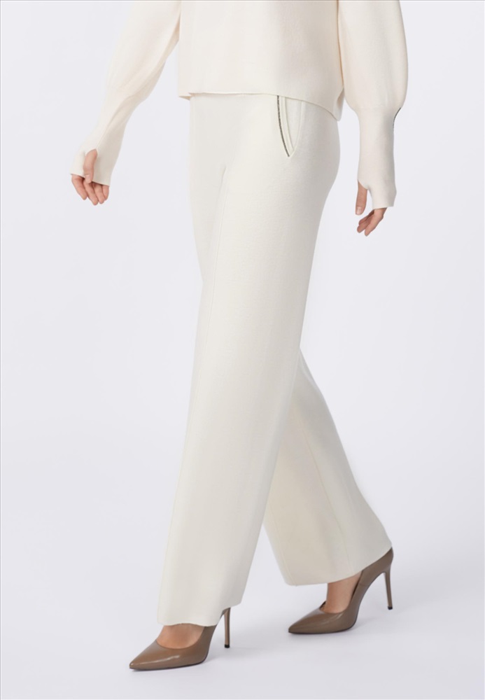 70% шерсть мериноса, 30% кашемир Брюки свободного кроя с из трикотажа интерлок. Высота посадки регулируется за счет широкого пояса-отворота из вязаной резинки. Стрелки на передних деталях отстрочены. Боковые карманы украшены металлизированной тесьмой (ручная работа). Низ брюк выполнен по технике бесшовного края, без отстрочки.