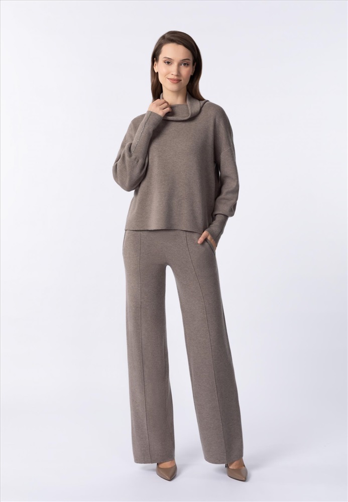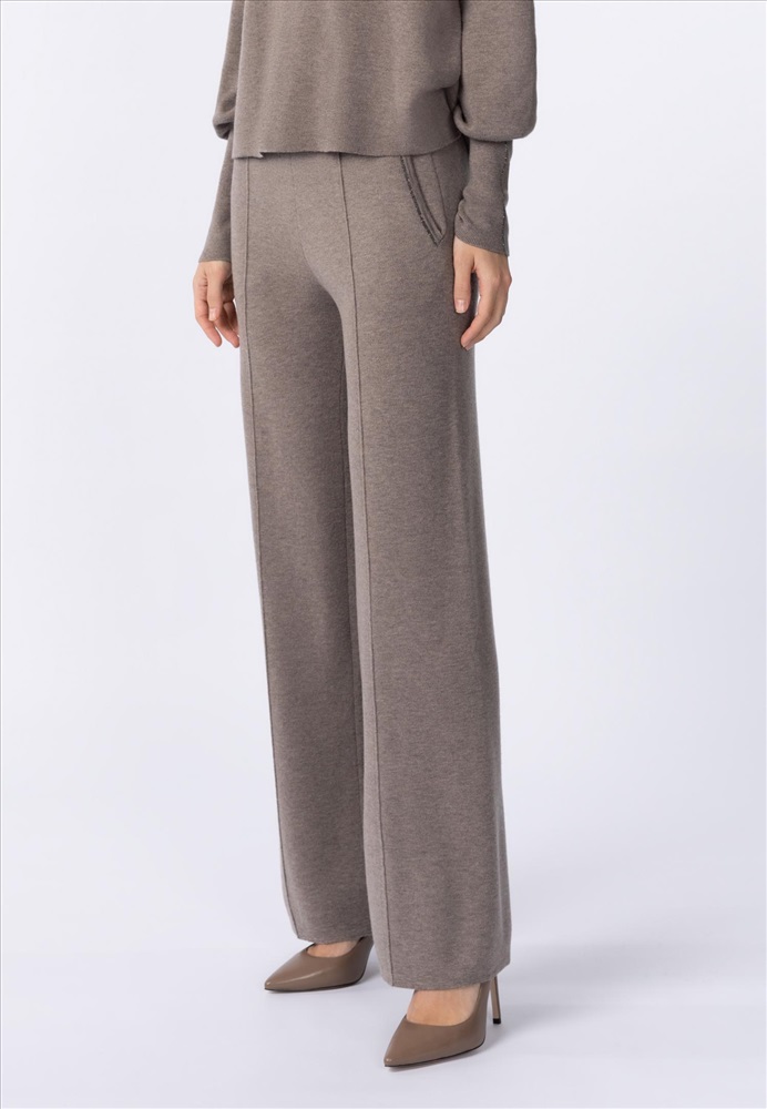 70% шерсть мериноса, 30% кашемир Брюки свободного кроя с из трикотажа интерлок. Высота посадки регулируется за счет широкого пояса-отворота из вязаной резинки. Стрелки на передних деталях отстрочены. Боковые карманы украшены металлизированной тесьмой (ручная работа). Низ брюк выполнен по технике бесшовного края, без отстрочки.