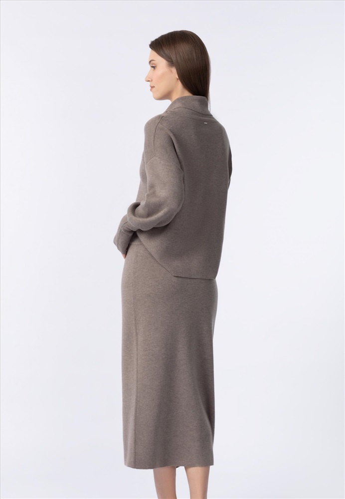 70% шерсть мериноса, 30% кашемир Юбка прямого кроя из трикотажа интерлок. Широкий пояс из мягкой вязаной резинки. Длина чуть ниже уровня колен. Спереди дополнительное запахивающееся полотнище. Край запаха сверху закреплен металлизированной тесьмой (ручная работа). Низ изделия выполнен по технике бесшовного края, без отстрочки.