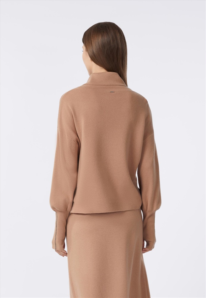 70% шерсть мериноса, 30% кашемир Укороченный джемпер свободного кроя из двуслойного трикотажа интерлок. Воротник-хомут с отворотом. Рукава-фонарик. Высокие манжеты с отверстием под большой палец. Манжета украшена металлизированной тесьмой (ручная работа). Низ изделия выполнен по технике бесшовного края, без отстрочки.