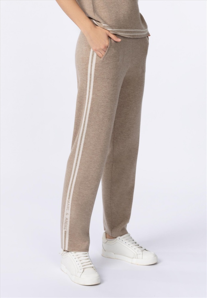 70% шерсть мериноса, 30% кашемир Брюки свободного прямого кроя. Пояс на резинке со шнуром. Боковые карманы. Контрастная отделка на поясе. По бокам отделка контрастной полосой с логотипом Marc & André с использованием блестящей нити.