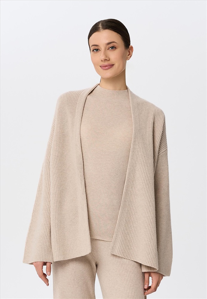50% кашемир, 50% шерсть мериноса Кардиган из двухслойного трикотажа в рубчик. Лаконичный прямой крой. Длина до бедер. Широкие прямые рукава, спущенная линия плеча. Съемный пояс позволяет отрегулировать посадку и сделать акцент на талии.