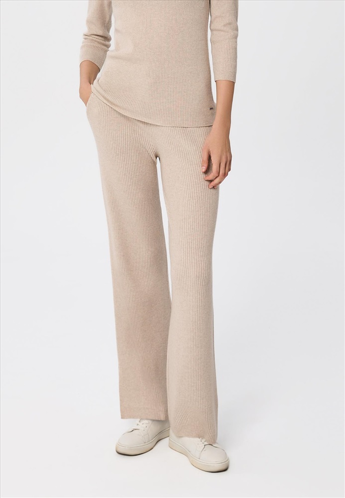 50% кашемир, 50% шерсть мериноса Брюки свободного кроя из трикотажа в рубчик. Легкий клеш за счет небольших боковых разрезов делает визуально силуэт стройнее. Эластичный пояс со шнуром. Боковые карманы декорированы тонкой металлизированной тесьмой (ручная работа).