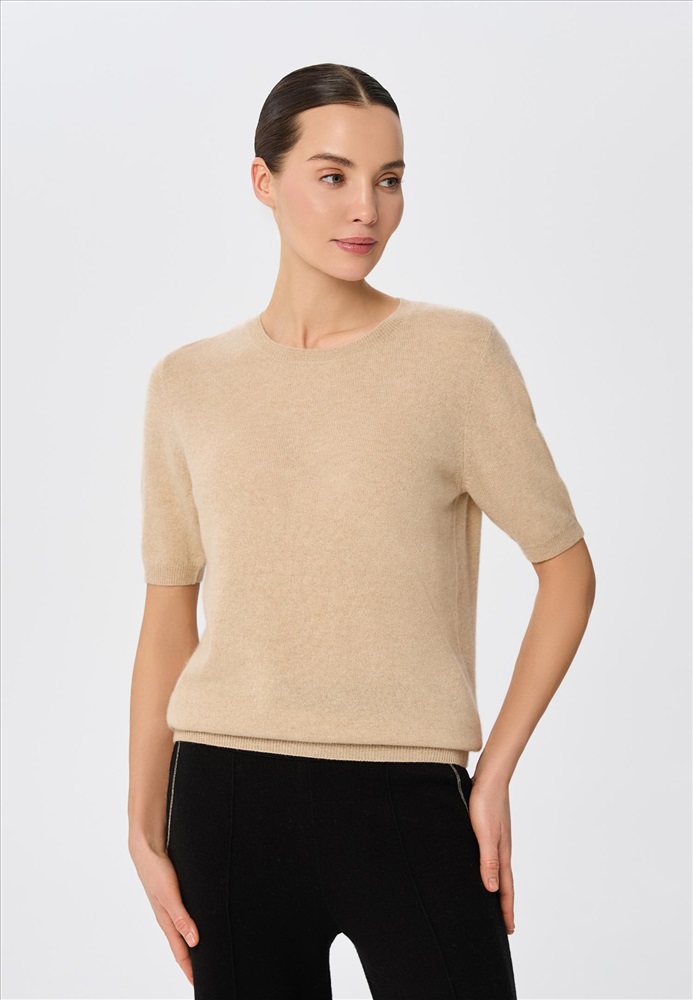 100% кашемир Джемпер с коротким рукавом. Прямой силуэт. Круглый вырез горловины. Низ рукава, низ изделия и горловина оформлены вязаной резинкой. Современная практичная модель для базового гардероба.