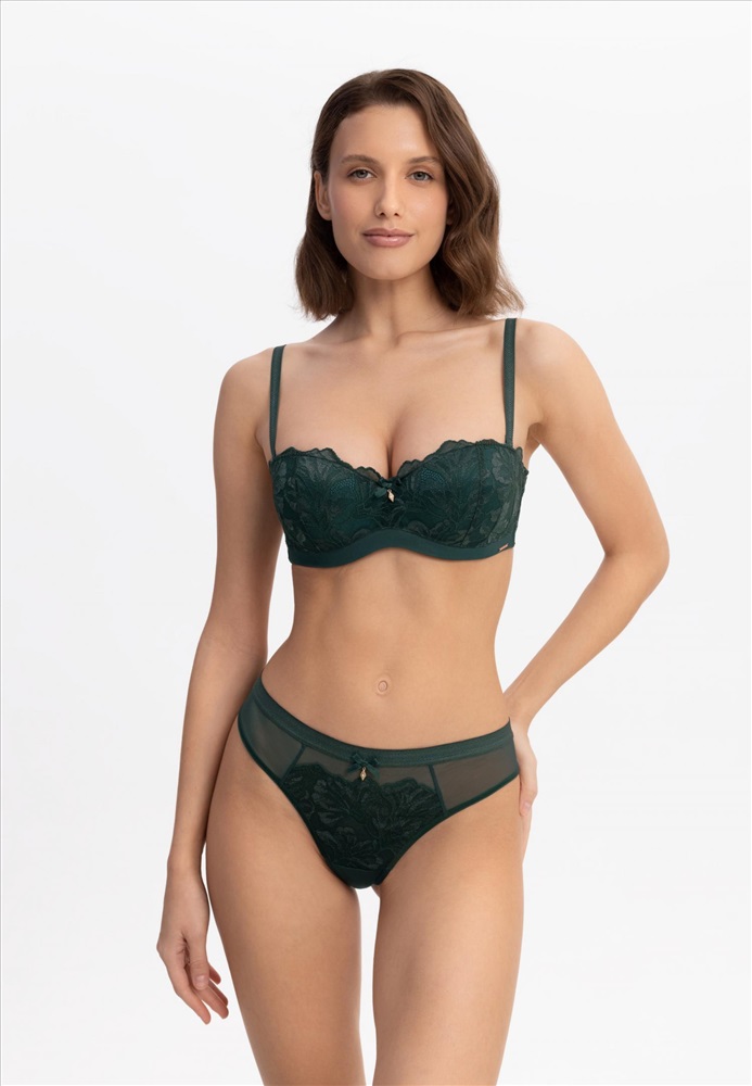 85% полиамид, 15% эластан Бюстгальтер-балконет с формованной чашкой и встроенным корректором «пуш-ап». Каркасная поддержка. Отделка с эффектом «скрытого каркаса». Кружевной стан на подкладке из сетки. Боковые поддерживающие косточки. Силиконовая лента по верхнему и нижнему краю. Дополнительный комплект силиконовых бретелей.