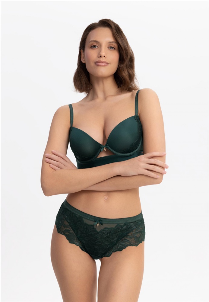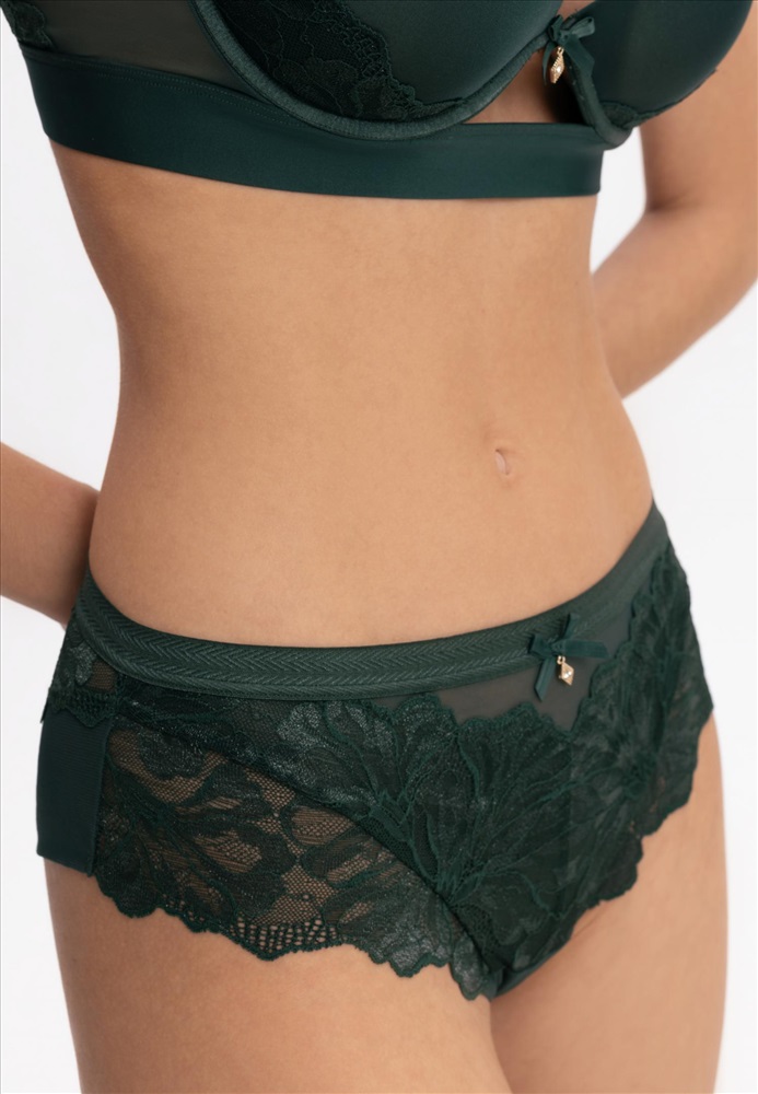 79% полиамид, 15% эластан, 6% хлопок Трусы-бразилиана со средней линией талии. Пояс выполнен из эластичной тесьмы. Передняя деталь из кружева на подкладке из сетки. Задняя деталь из кружева и двойной сетки в подворот.