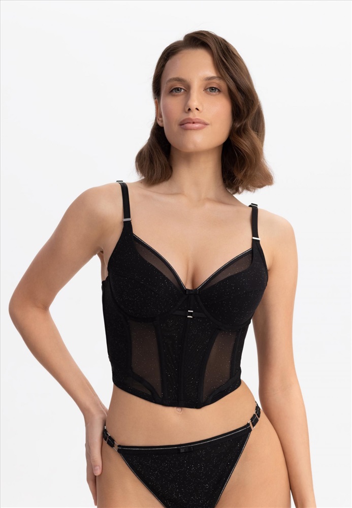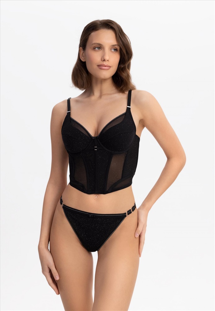 85% полиамид, 15% эластан Полукорсет с полудублированной поролоновой чашкой на каркасной поддержке. Чашки декорированы эластичной сеткой с микроблестками. Чашки с внутренней стороны выполнена из хлопка. По линии декольте эластичная тесьма с серебристой нитью. Комбинированный стан из эластичной сетки с микроблестками и сетки mesh. Боковые косточки.