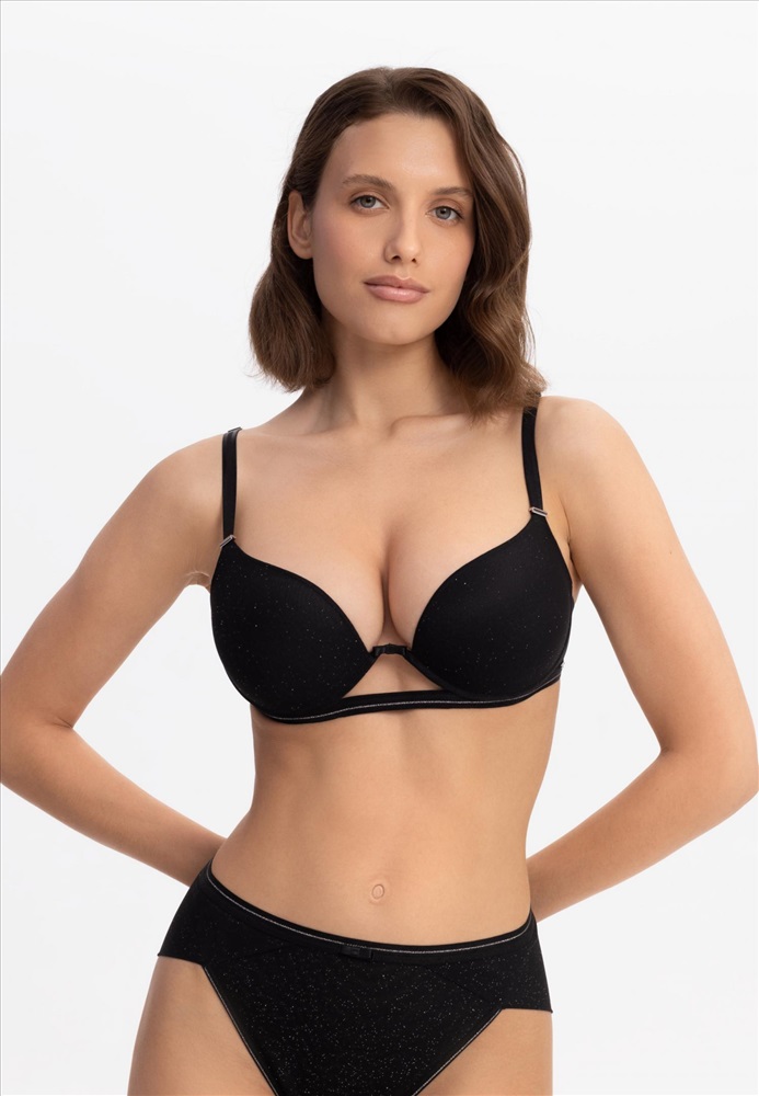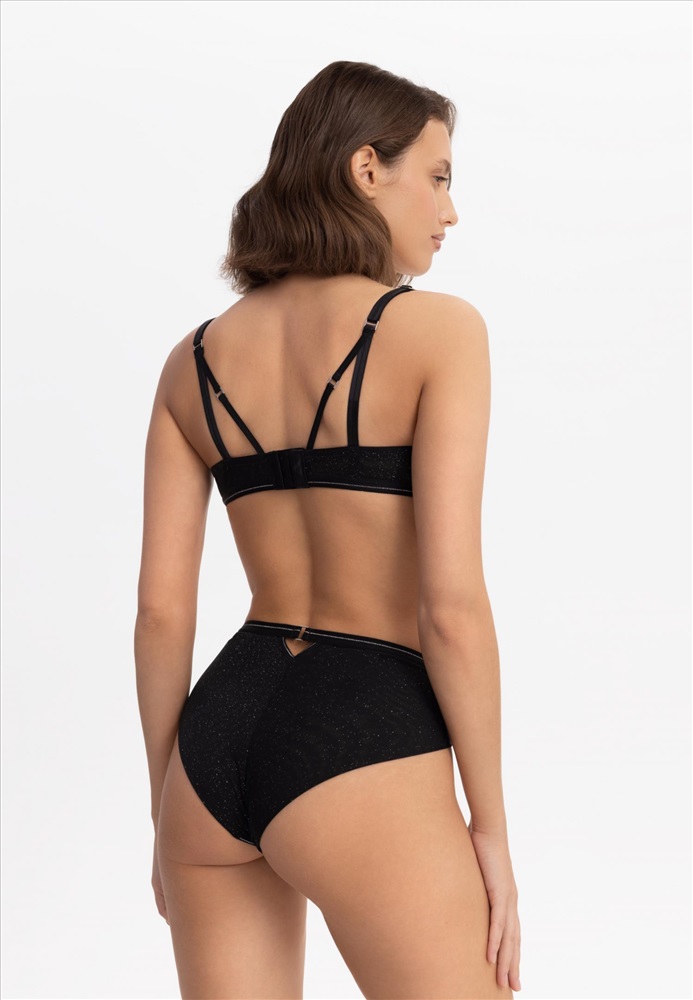 85% полиамид, 15% эластан Бюстгальтер на монокаркасной поддержке с формованной чашкой и съемными корректорами «пуш-ап». Под грудью эластичная тесьма с серебристой нитью. Стан выполнен из эластичной сетки с микроблестками на подкладке. Чашки с лицевой стороны покрыты сеткой с микроблестками.