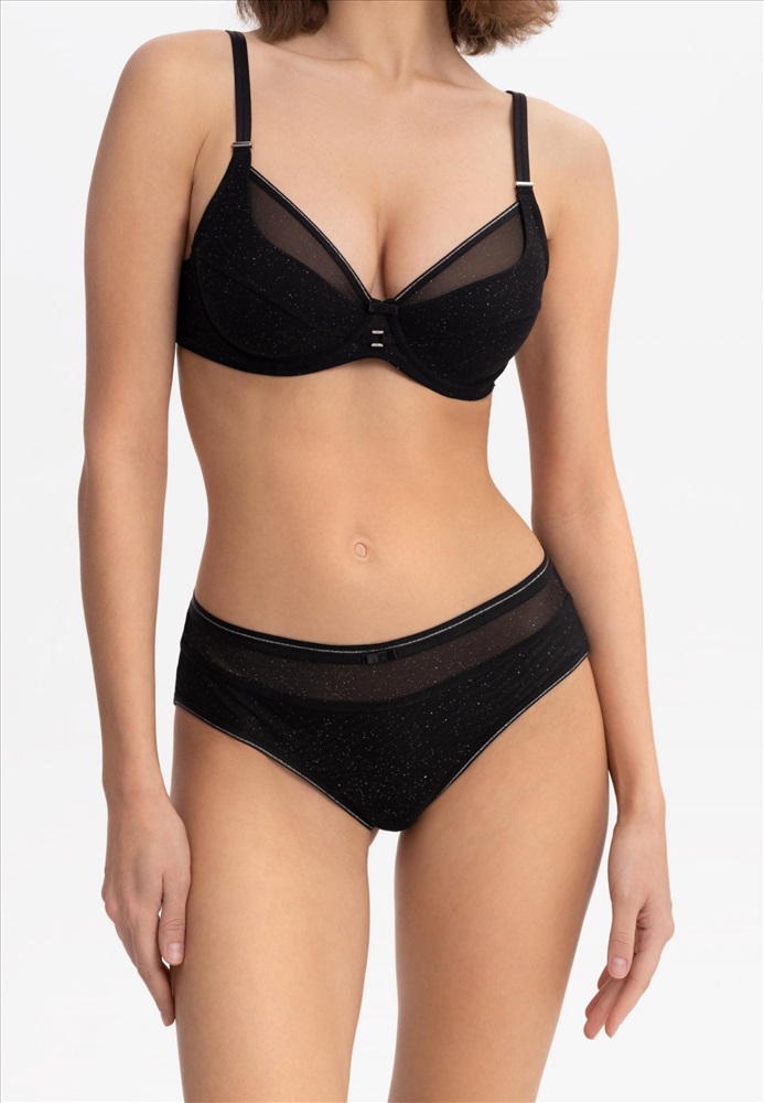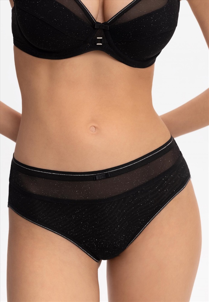79% полиамид, 15% эластан, 6% хлопок Трусы-бразилиана со средней линией талии. Передняя деталь из сетки с микроблестками на подкладке из мягкой сетки. Задняя деталь: двойная сетка в подворот. Пояс выполнен из эластичной тесьмы с серебряной нитью.