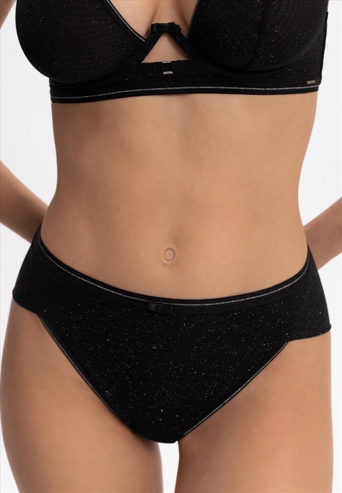 79% полиамид, 15% эластан, 6% хлопок Трусы-бразилиана с завышенной линией талии. Передняя деталь из эластичной сетки с микроблестками на подкладке. Задняя деталь: двойная сетка с микроблестками в подворот. Пояс выполнен из эластичной тесьмы с серебристой нитью.
