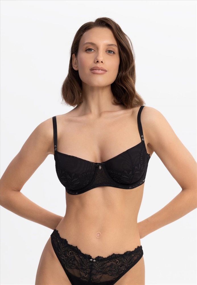 85% полиамид, 15% эластан Бюстгальтер с мягкой чашкой на каркасной поддержке. Чашки выполнены из двойной полупрозрачной сетки и декорированы кружевом. Кружевной стан на подкладке из сетки.