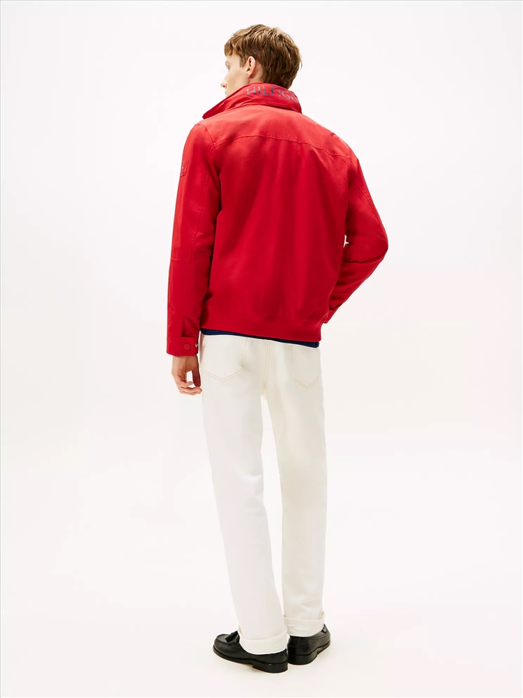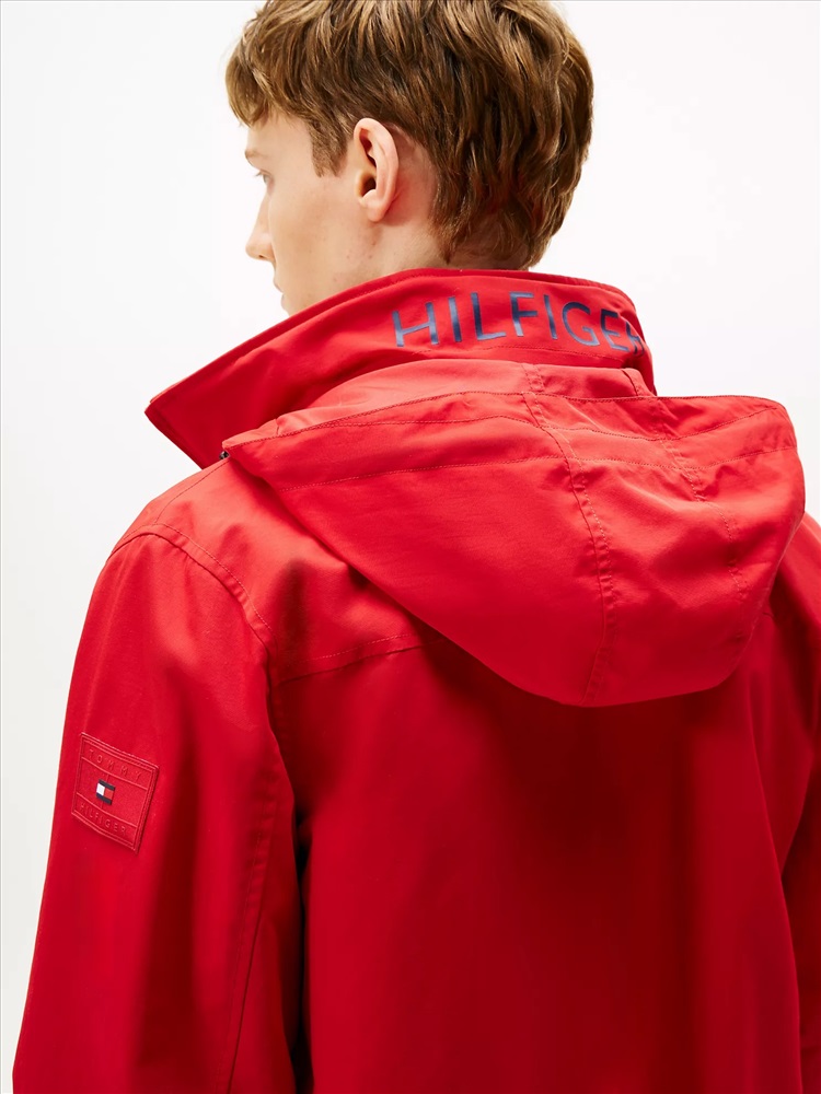 Tommy Hilfiger men's jacket. Our water-resistant regatta jacket blends form and function in classic Tommy style. Designed with a concealed hood under the collar, this outerwear layer is light, super versatile and ready to take on whatever Mother Nature throws at you.