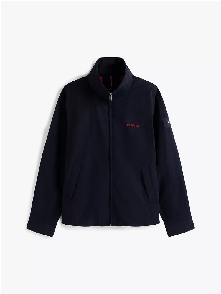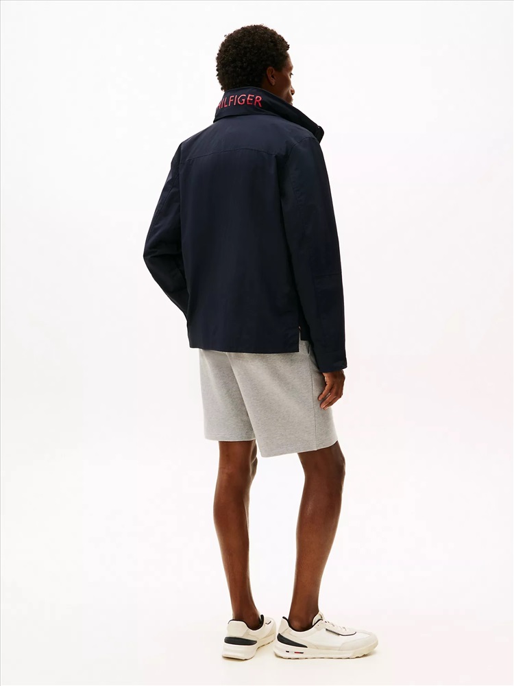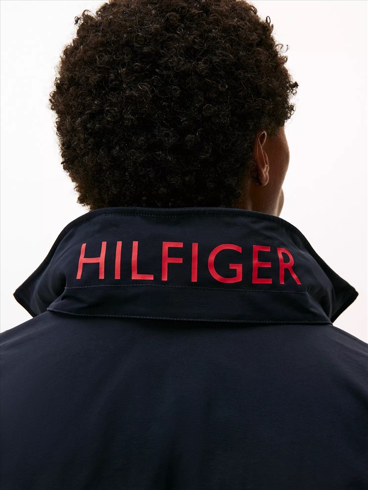 Tommy Hilfiger men's jacket. Our water-resistant regatta jacket blends form and function in classic Tommy style. Designed with a concealed hood under the collar, this outerwear layer is light, super versatile and ready to take on whatever Mother Nature throws at you.