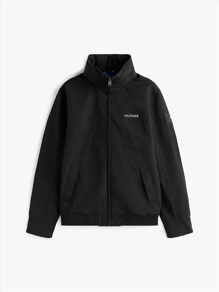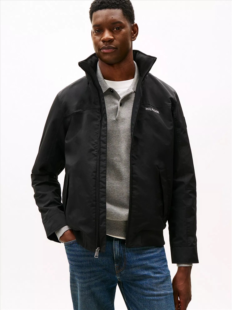 Tommy Hilfiger men's jacket. Our water-resistant regatta jacket blends form and function in classic Tommy style. Designed with a concealed hood under the collar, this outerwear layer is light, super versatile and ready to take on whatever Mother Nature throws at you.