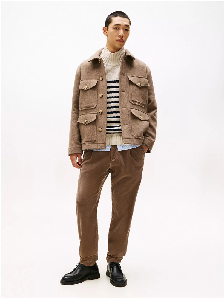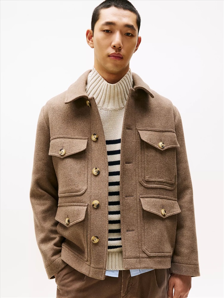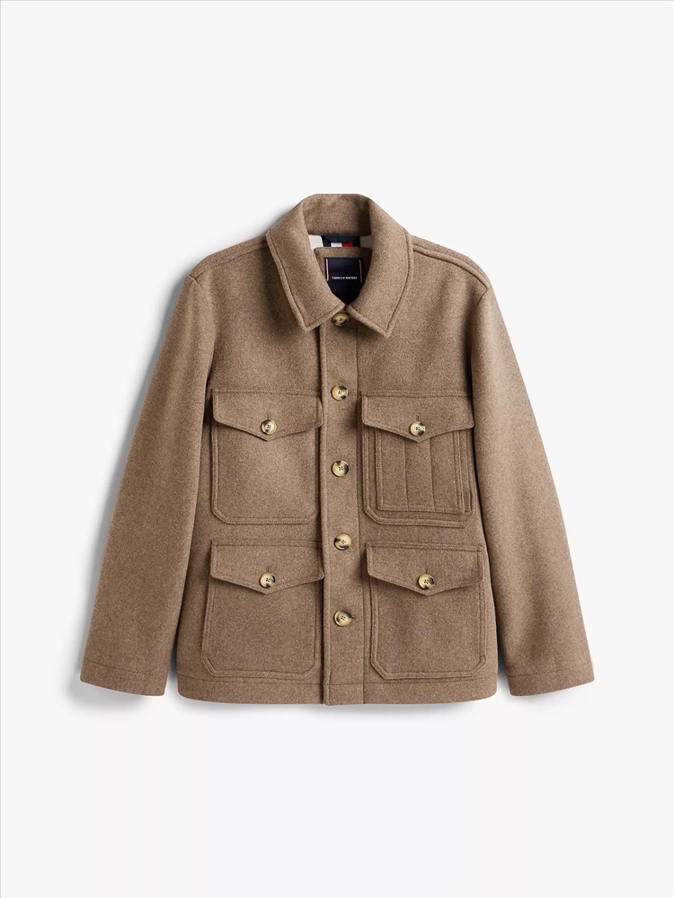 Tommy Hilfiger men's jacket. Elevate your casual looks with this polished utility jacket, made from a luxurious wool blend and finished with tonal logo detailing at the back.