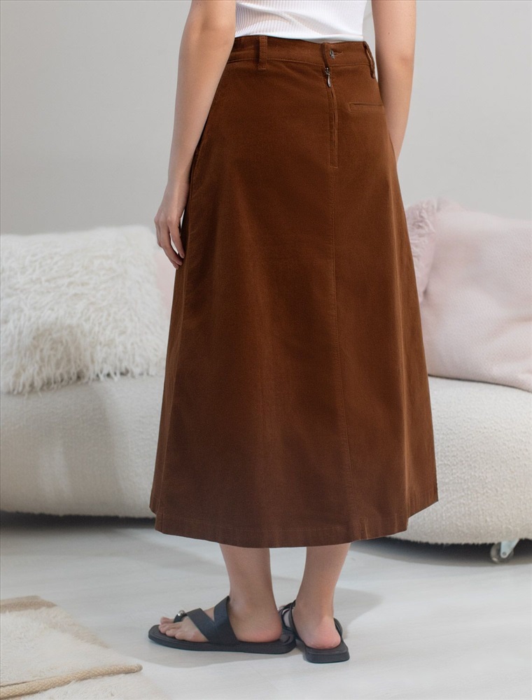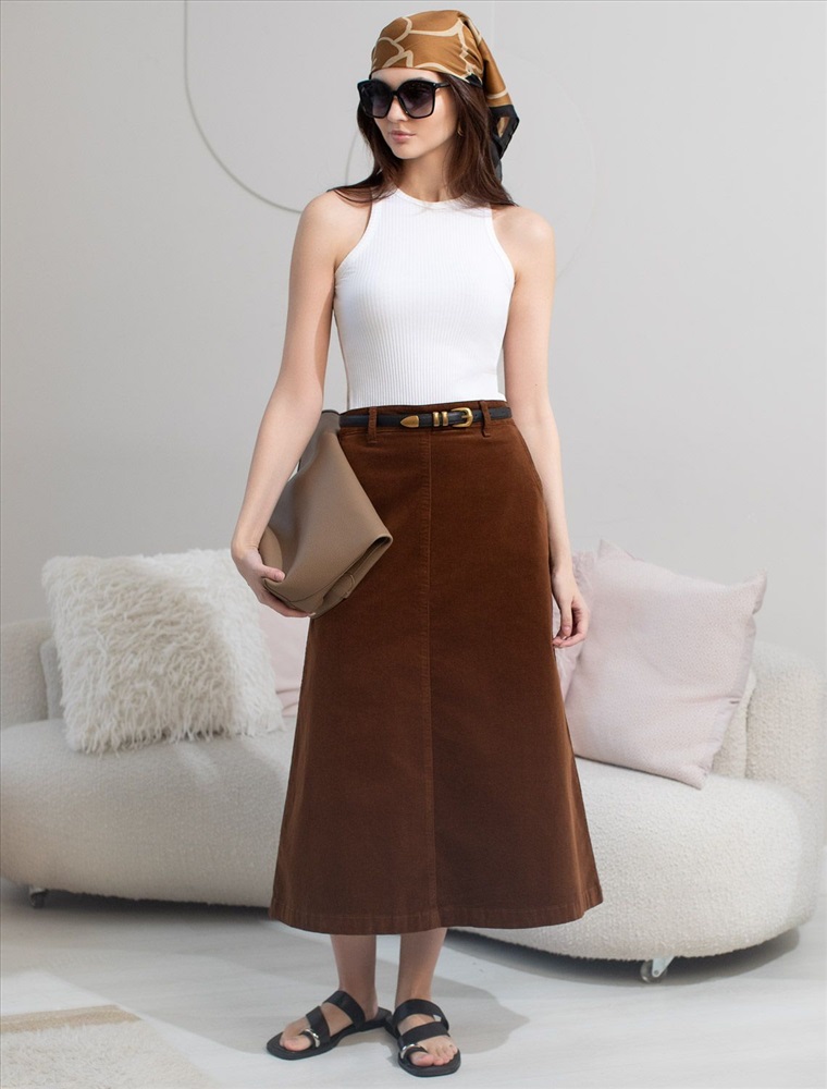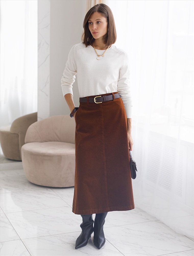 Размер товара на первом фото: 42 Юбка-миди трапециевидного силуэта выполнена из мягкого хлопкового микро-вельвета с добавлением эластана. Изделие комфортно садится по фигуре и не сковывает движения. Модель дополнена высококачественной фурнитурой с фирменным логотипом бренда. Хорошо комбинируется с вязаным трикотажем, блузками и денимом.Также прекрасно станет альтернативой деловым низам в нестрогом офисном дресс-коде.
