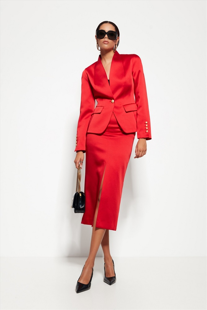 Модель из коллекции Party 2026 — юбка миди с разрезом, создающая изящный и динамичный силуэт. Минималистичный дизайн делает акцент на линии юбки и разрезе, придавая образу утончённость и стиль.