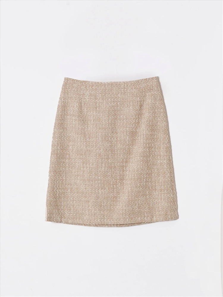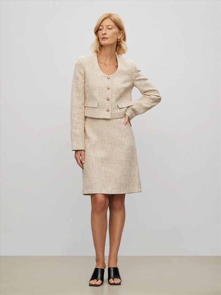Элегантная юбка для образов в стиле тихой роскоши. Выполнена из мягкого бежевого твида с высоким содержанием хлопка. Модель имеет высокую посадку и длину чуть выше колена. Застёгивается на молнию на спинке. Выполнена на подкладке. Идеально сочетается с жакетом из комплекта, а также трикотажными или сатиновыми топами пастельных тонов.