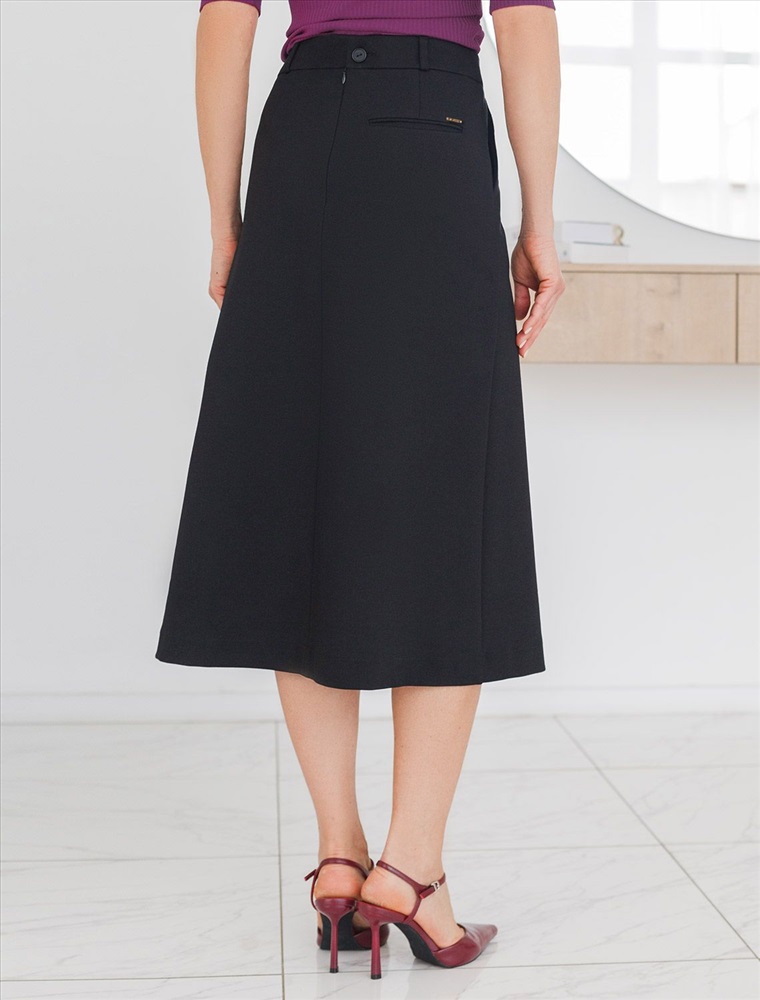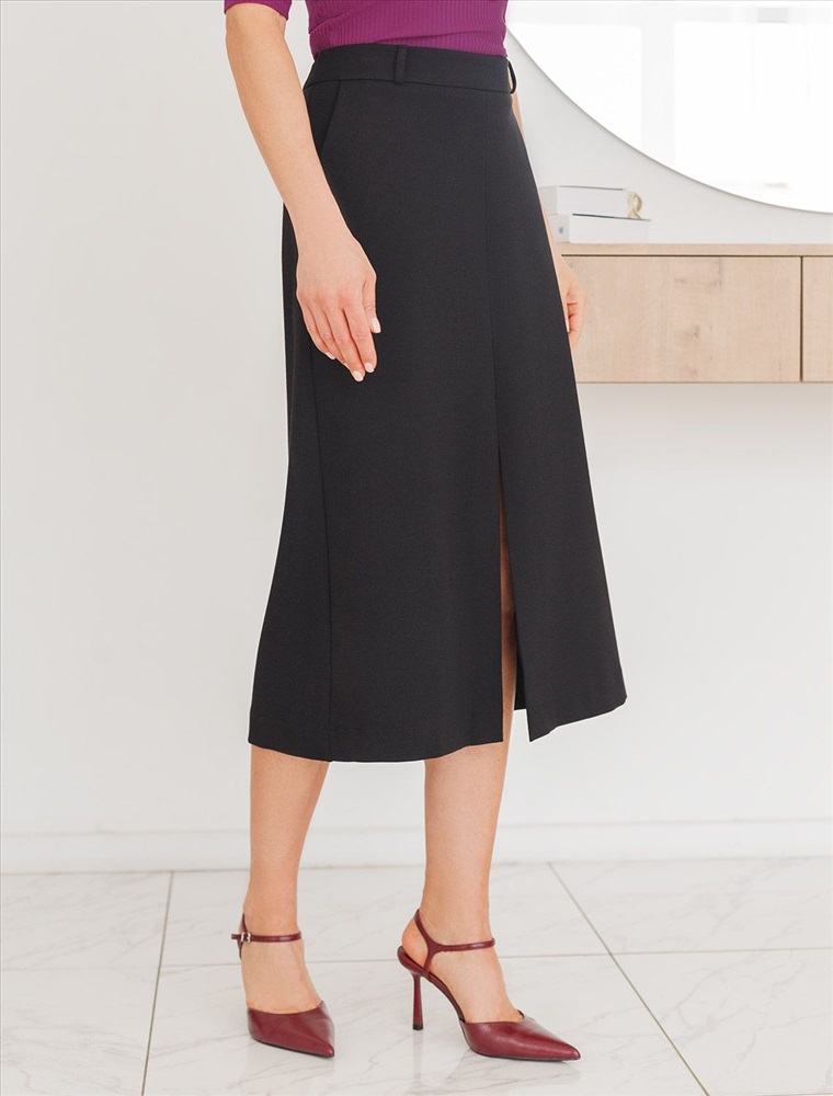 Юбка А-силуэта выполнена из джерси. Модель дополнена шлевками для пояса, высоким разрезом спереди и боковыми карманами. Изделие хорошо держит форму, отлично тянется и почти не мнется во время использования. Идеальный вариант в офис или в повседневный классический стиль.
