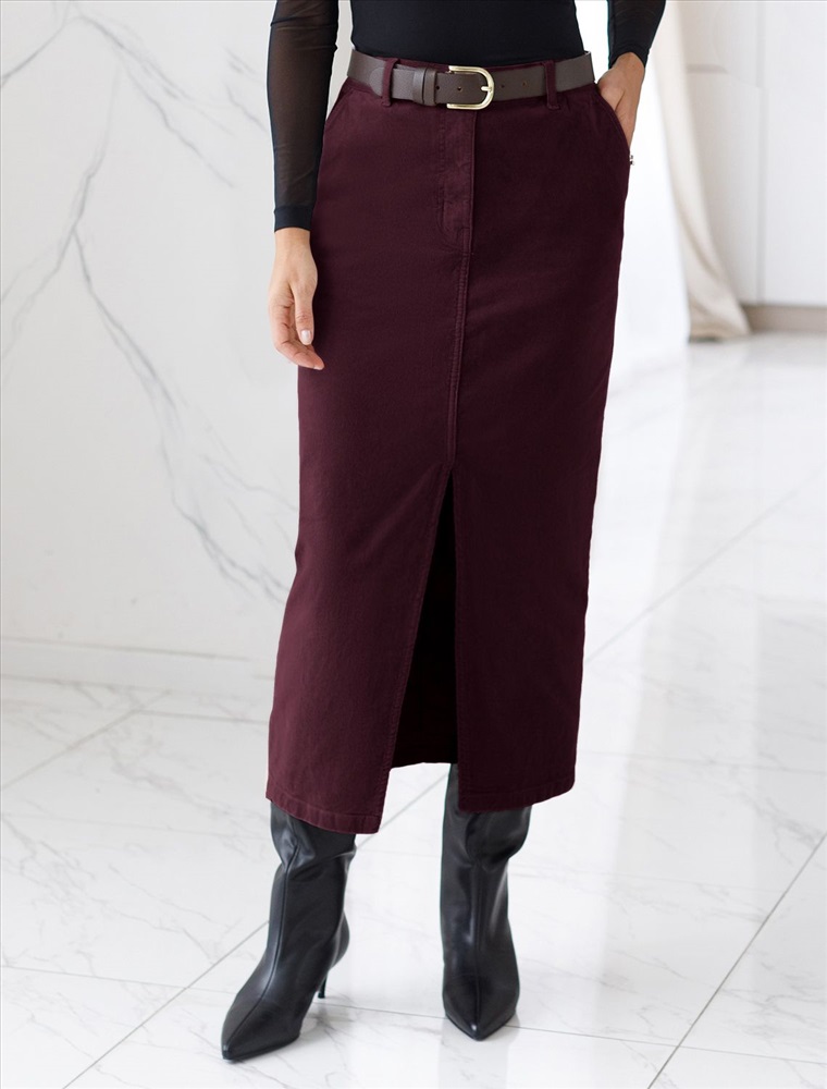 Юбка прямого кроя с выполнена из мягкого хлопкового микро-вельвета с добавлением эластана. Модель дополнена высоким разрезом спереди. Изделие комфортно садится по фигуре и не сковывает движения. Хорошо комбинируется с вязаным трикотажем, блузками и денимом. Также прекрасно станет альтернативой деловым низам в нестрогом офисном дресс-коде.