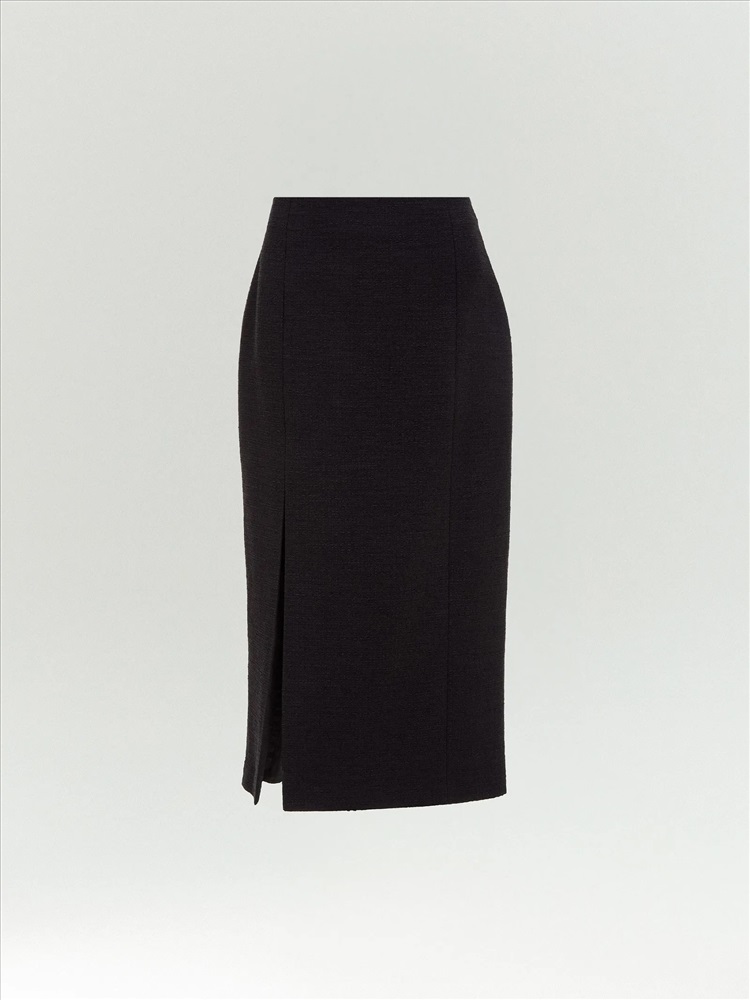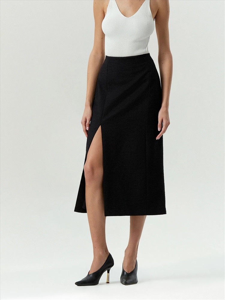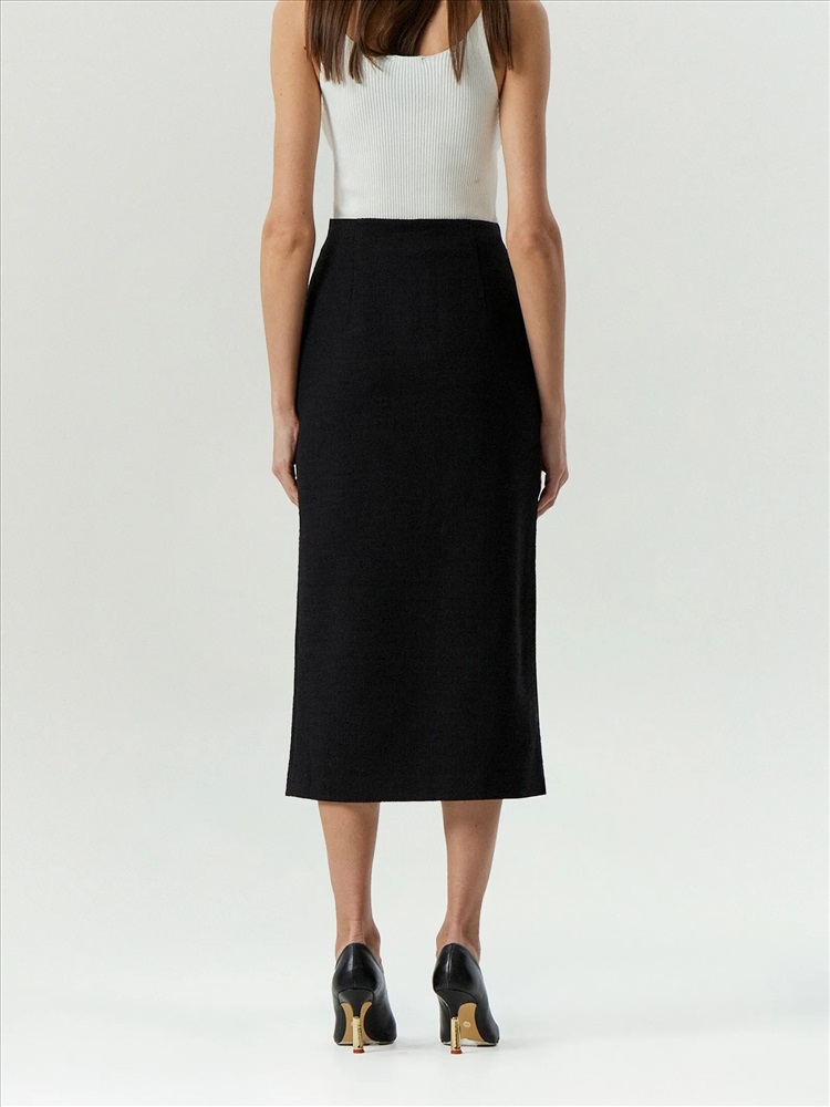 Юбка из чёрного хлопкового твида хороша для нарядных, деловых и даже повседневных образов. Элегантная модель-футляр имеет высокую посадку и длину миди. Дополнена модным разрезом с одной стороны. Застёгивается на молнию сбоку. Сделана на подкладке с высоким содержанием вискозы. Эффектно завершить образ с юбкой поможет жакет из комплекта.