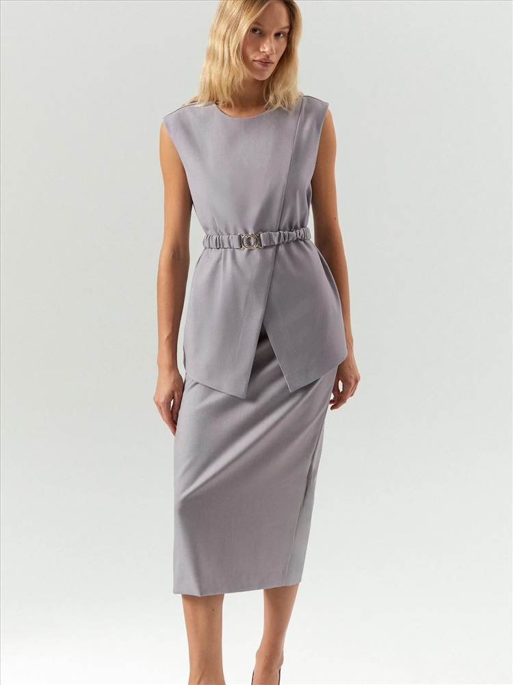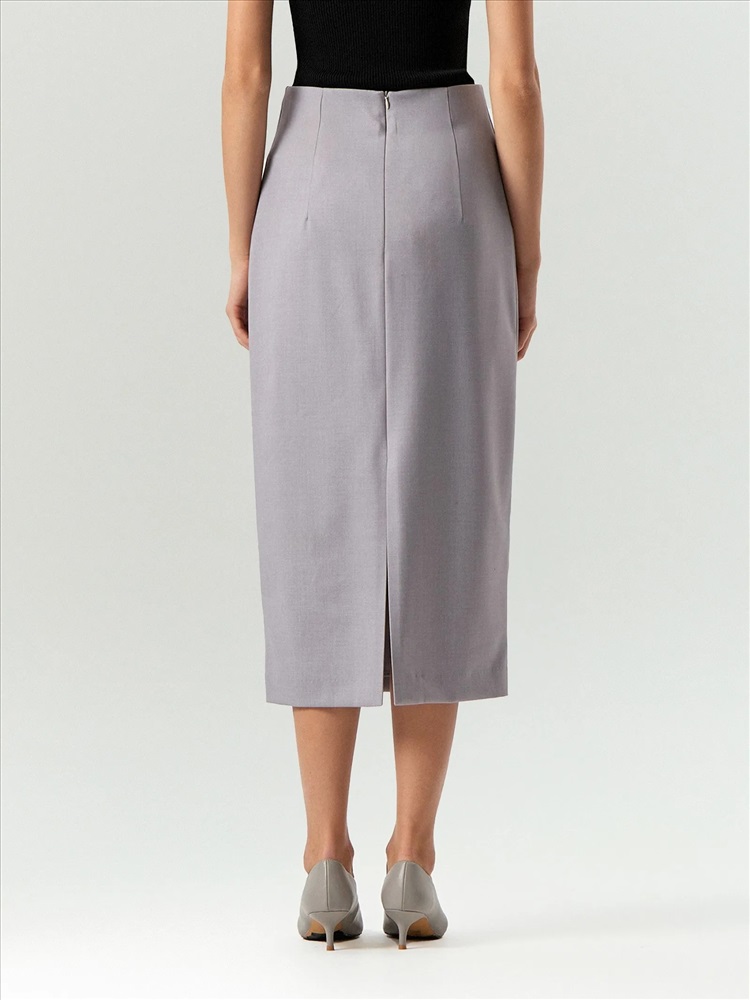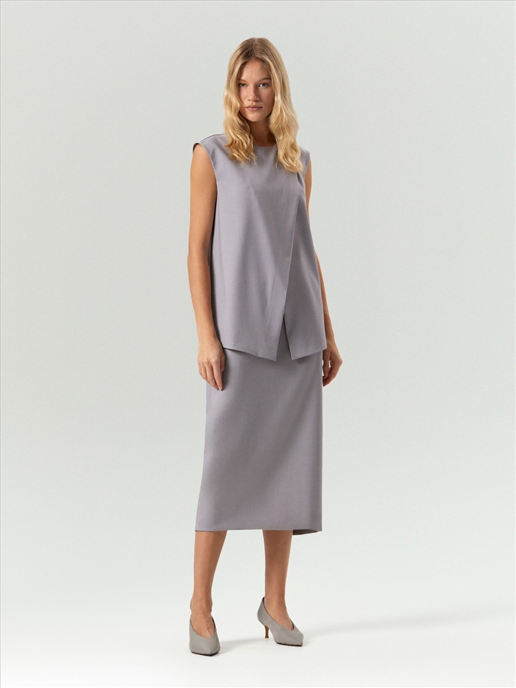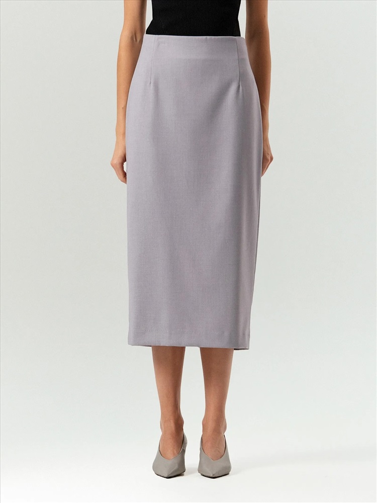 Юбка отличается изысканным оттенком: серый с лиловым подтоном выглядит необычно. По-весеннему лёгкая костюмная ткань с содержанием вискозы комфортно ощущается на теле. Юбка-карандаш длины миди с высокой посадкой хорошо садится по фигуре, визуально вытягивает силуэт. Имеет разрез сзади для большей свободы движения. Застегивается на молнию. Сделана на подкладке с вискозой. Можно дополнить жилетом из комплекта. Юбка может стать частью капсулы с жилетом и юбкой piter.