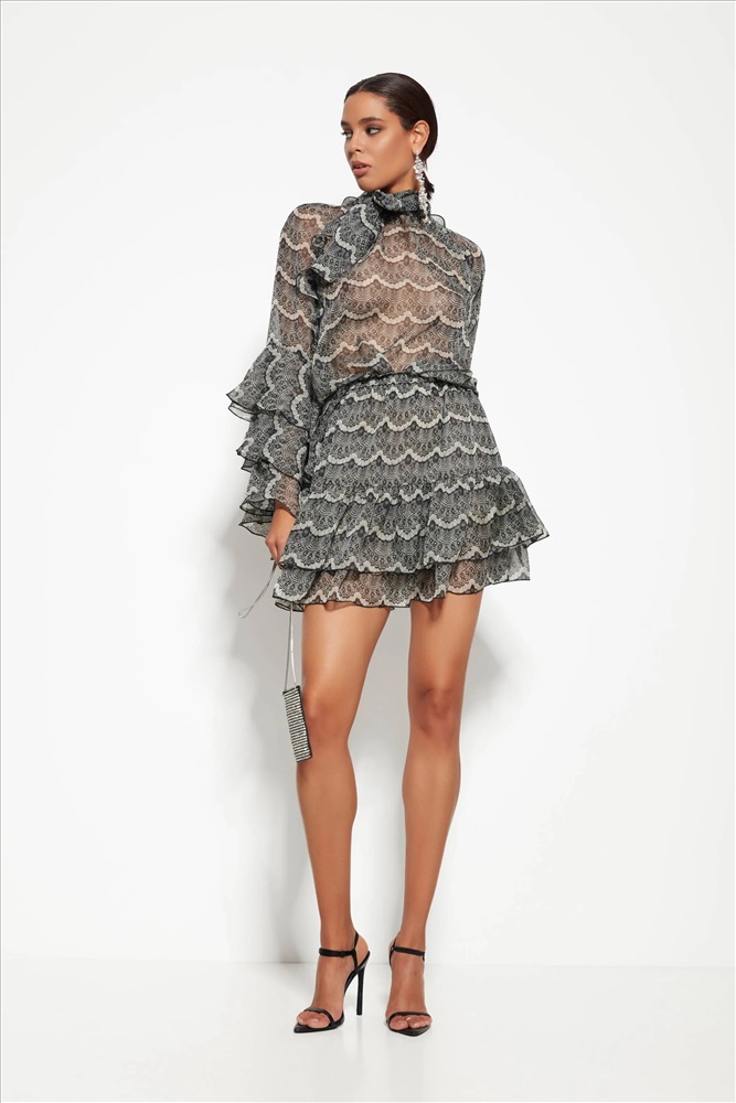 Юбка Lakbi 55258: струящаяся модель с акцентным принтом и воланами — эффектный вечерний образ. Ключевые особенности: Комментарии к товару